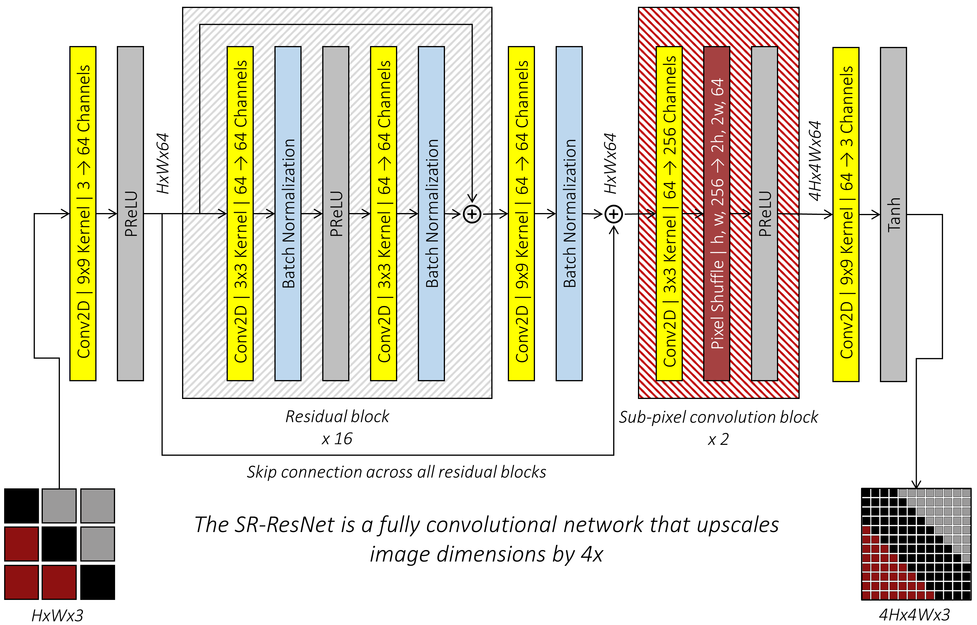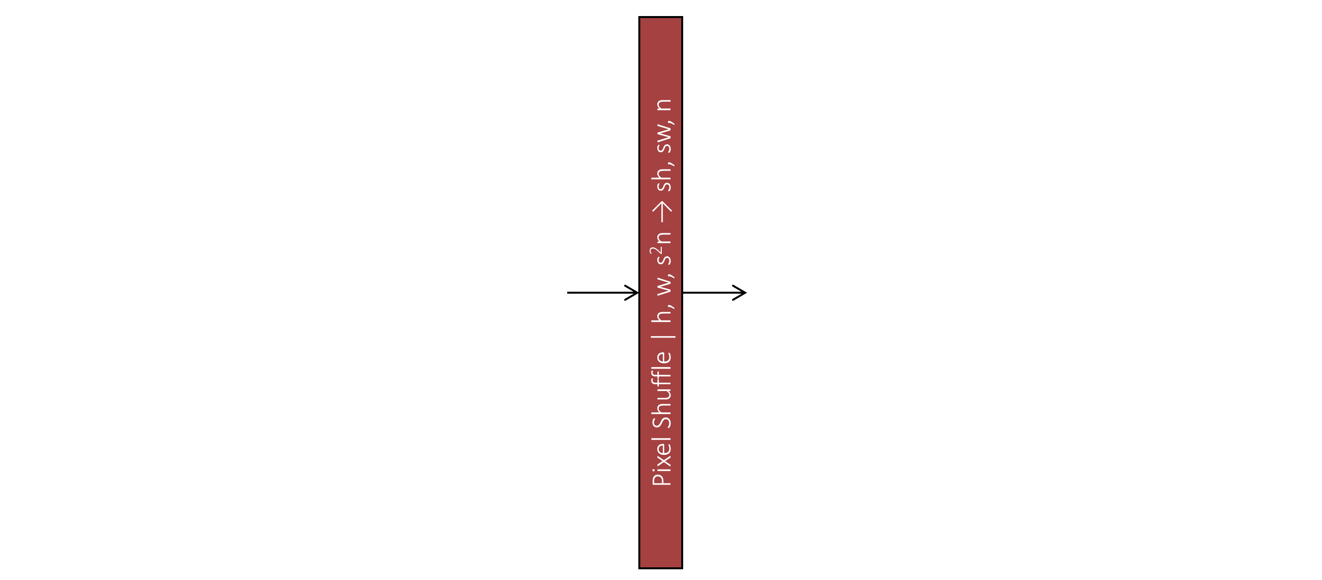 这是一个自定义层,由一个将通道数扩展到$s^2n$的二维卷积组成,其中$s$为缩放因子,$n$为上采样后图像所需的输出通道数,随后接一个PyTorch 的nn.PixelShuffle(),用于在SRResNet和生成器网络中执行上采样操作。