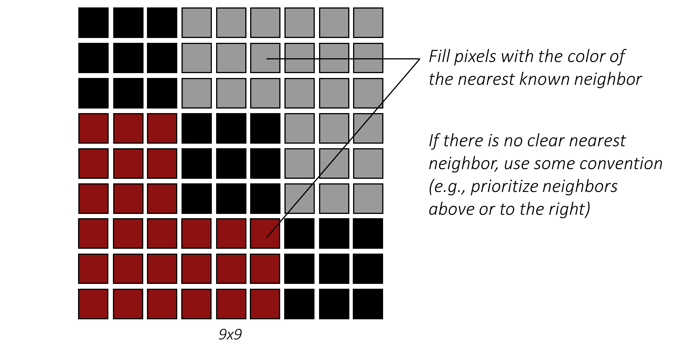 然后,我们将每个新像素的值设置为其最近邻已知像素的值: