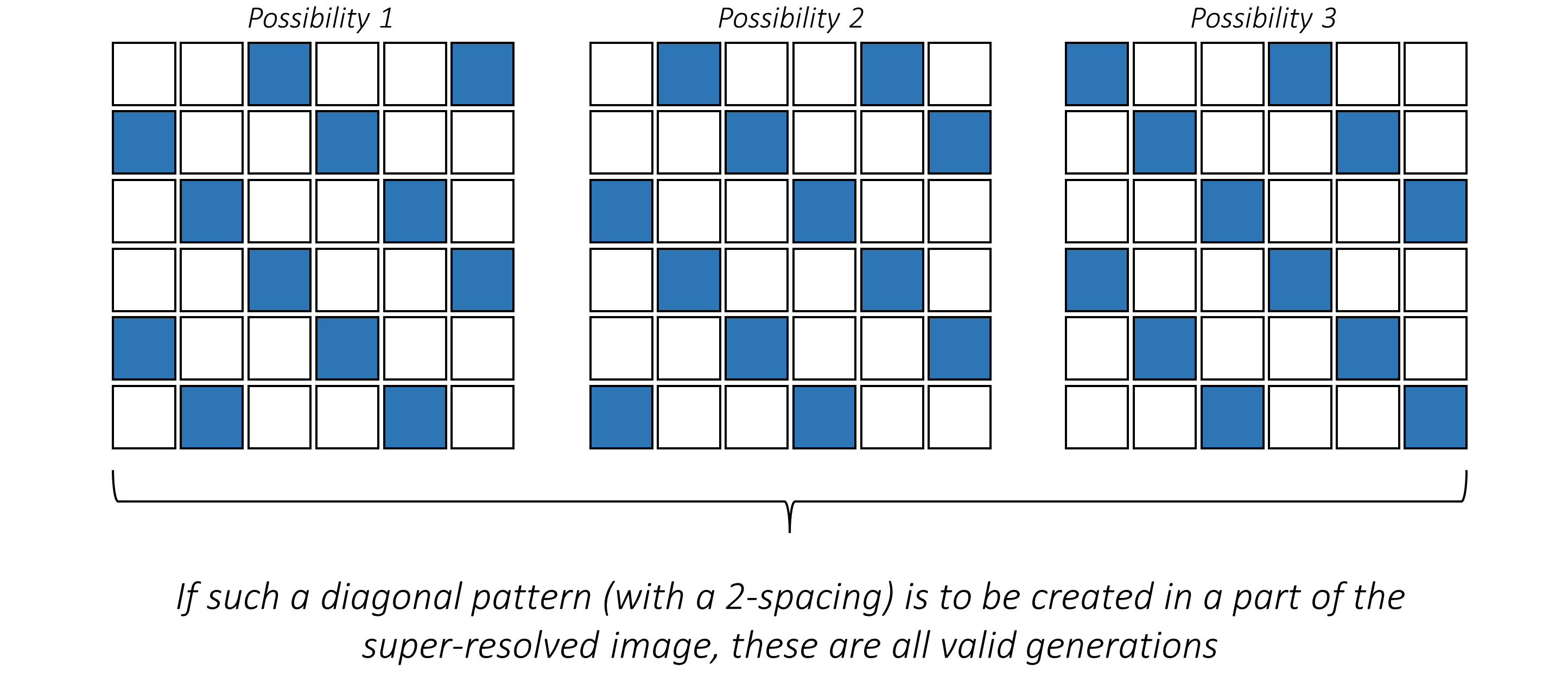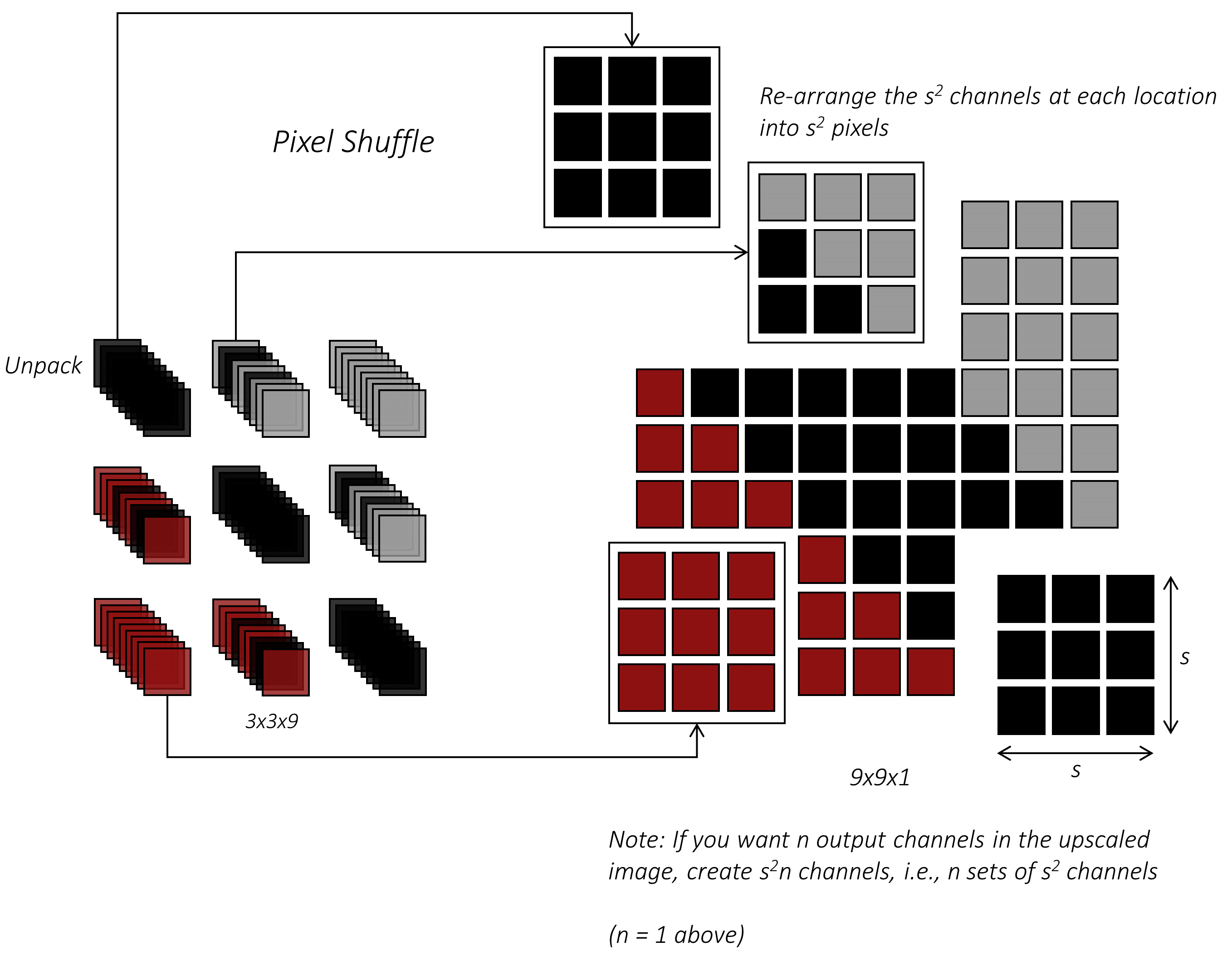 在上面的例子中,高分辨率图像只有一个输出通道。如果你需要 $n$ 个输出通道,只需生成 $n$ 组各 $s^2$ 个通道,然后在每个位置将它们洗牌成 $n$ 组 $s \times s$ 的小块。