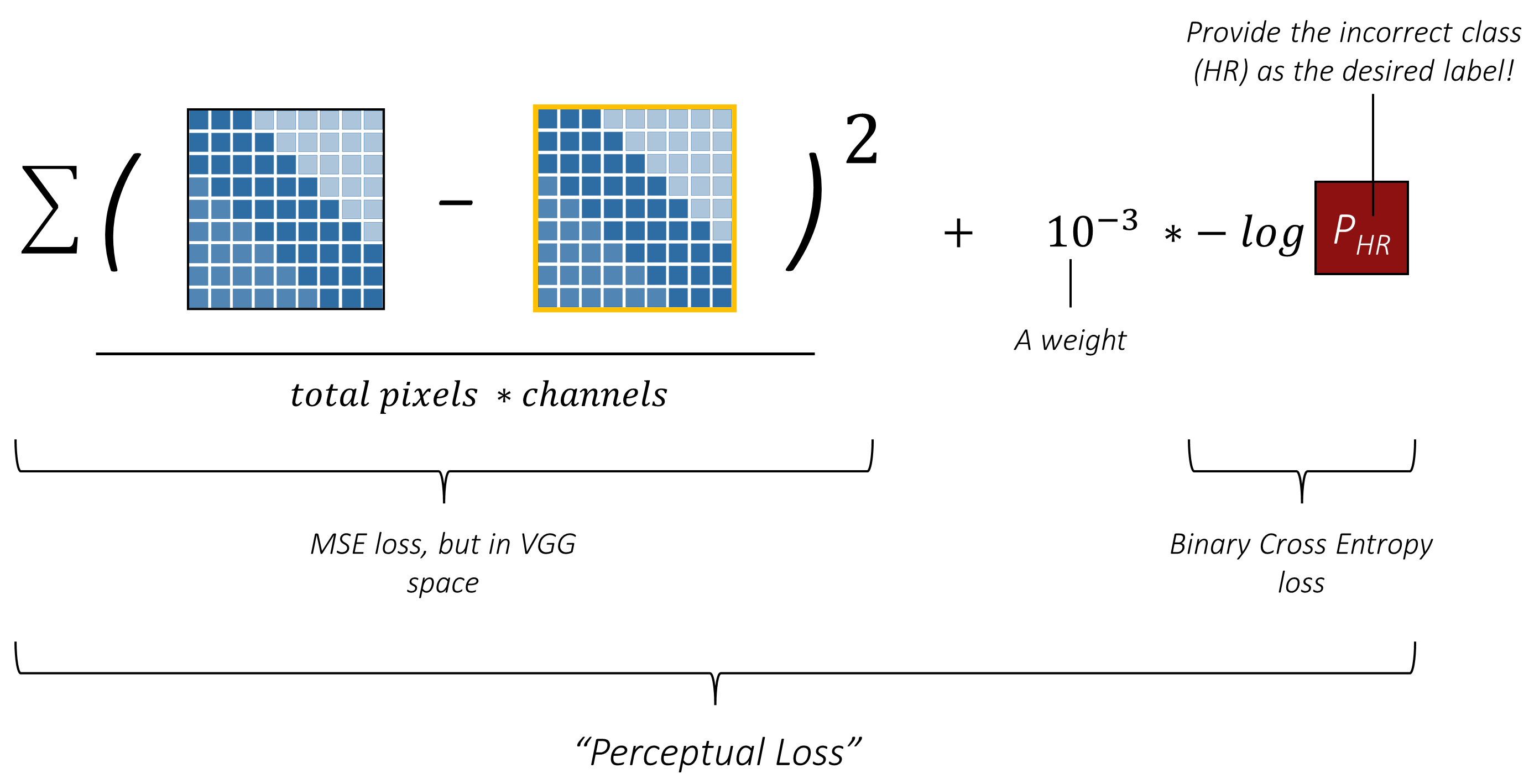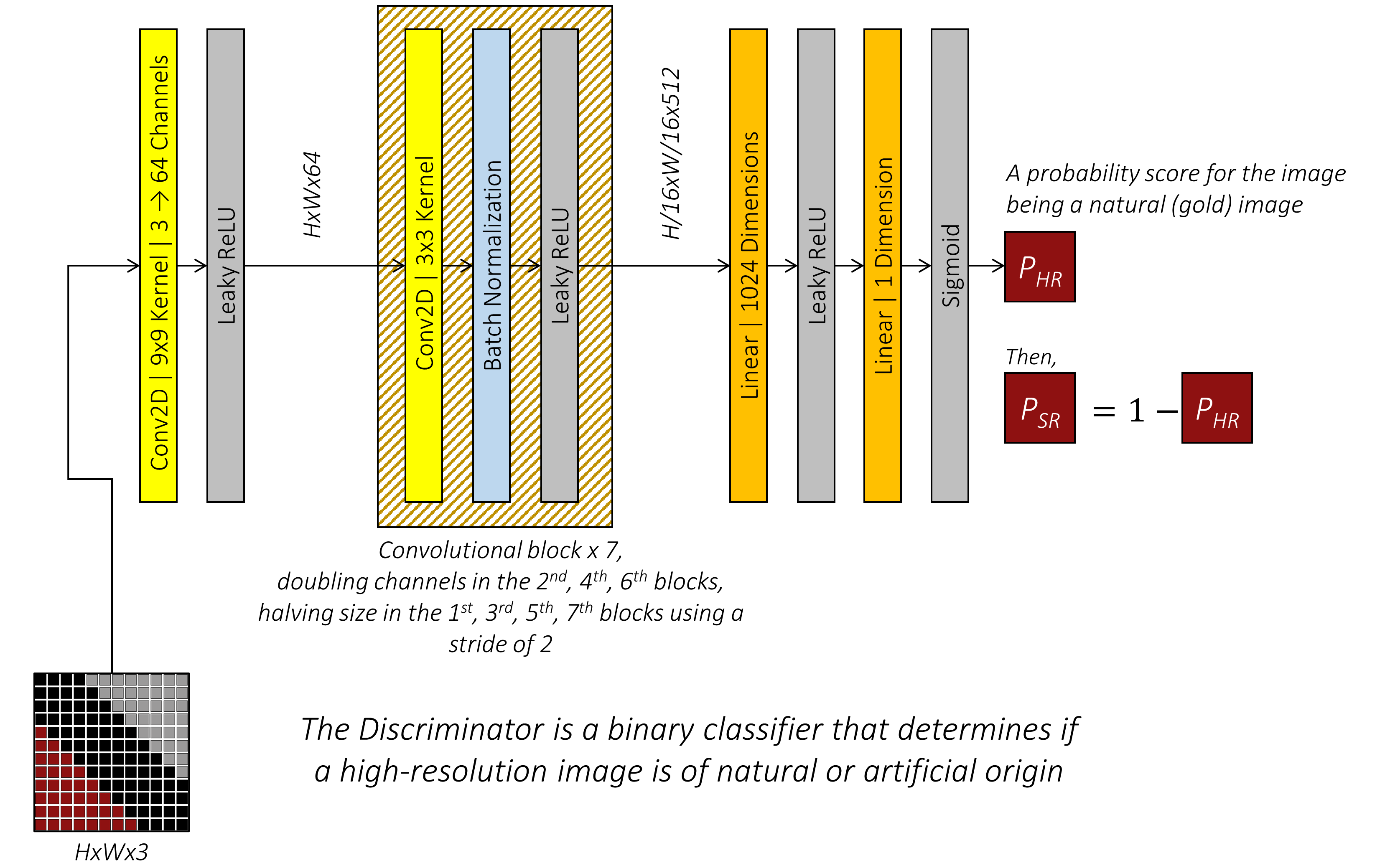 在训练生成器时,我们将超分辨率图像输入判别器,并利用判别器的输出与错误但期望的 $HR$ 标签一起计算对抗损失函数。