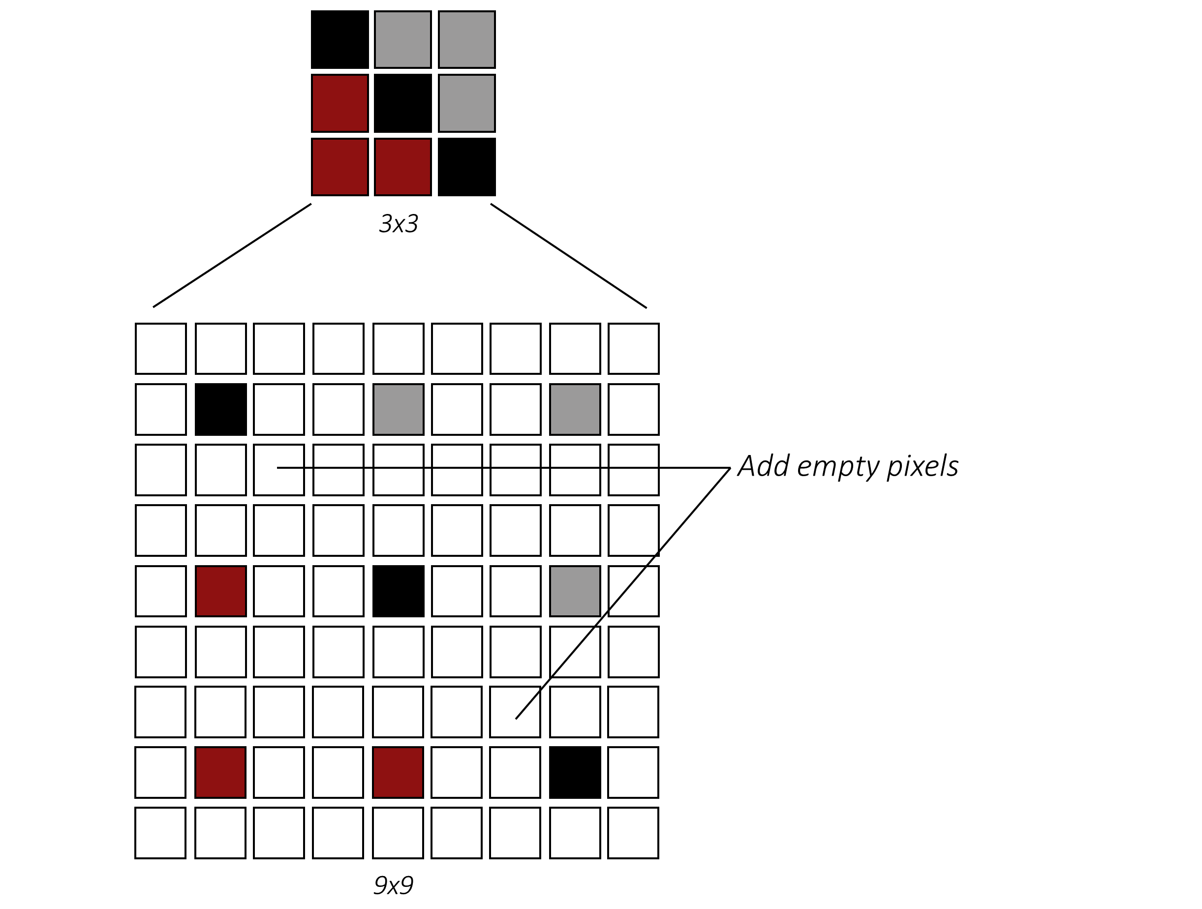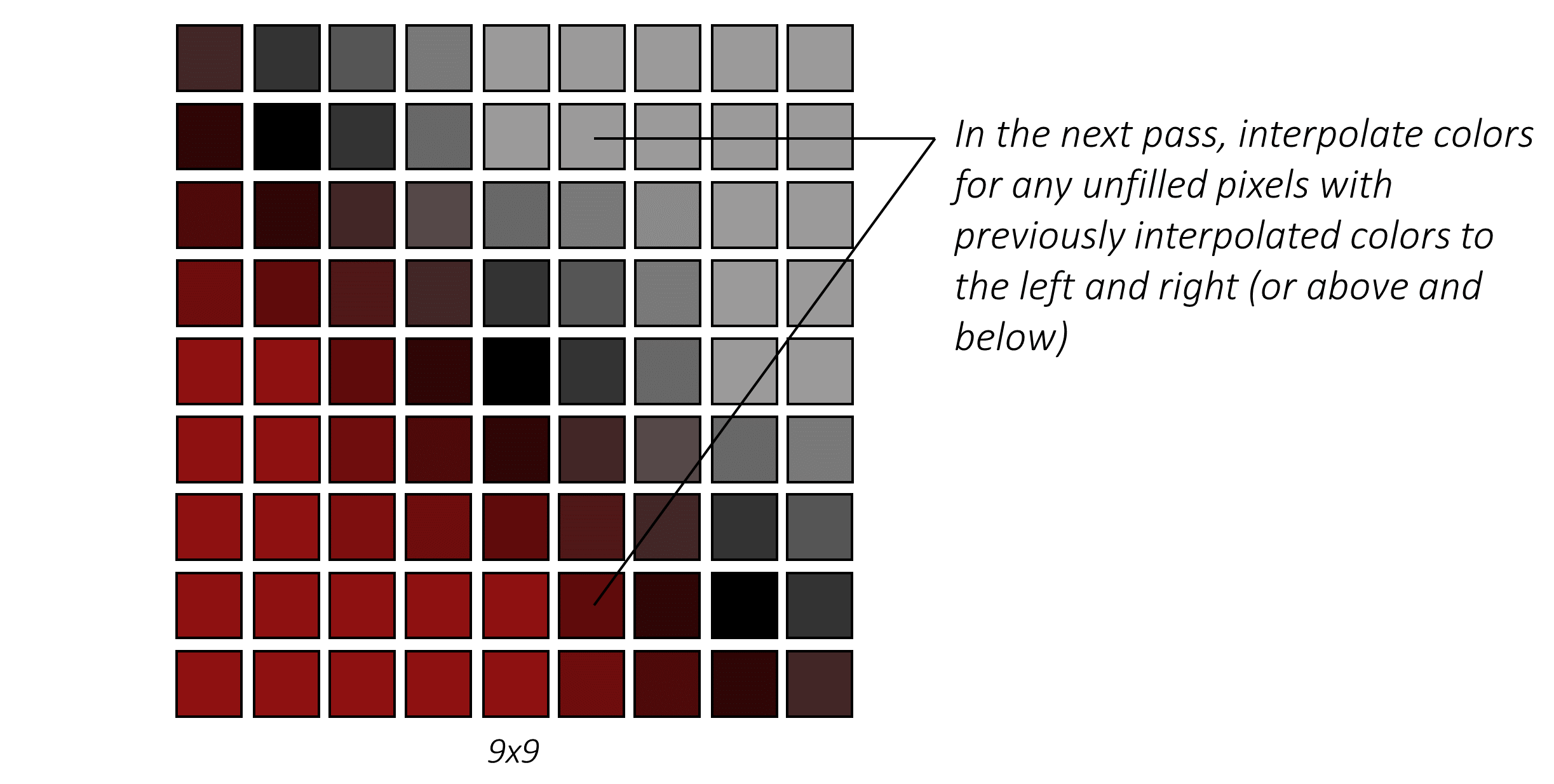 首先,我们在已知像素之间按照所需分辨率插入新的空白像素: