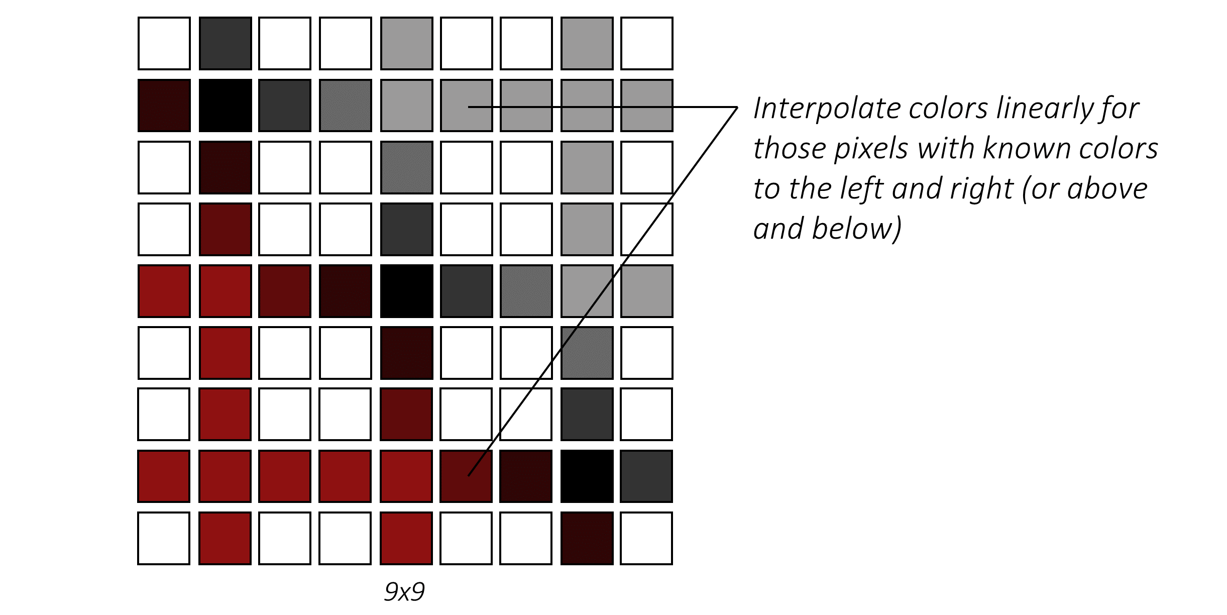 接下来,我们需要为这些空白像素填充颜色。如果我们采用线性插值法,利用距离最近的两个已知像素(即每侧各一个)来计算新像素的值,这就称为双线性上采样: