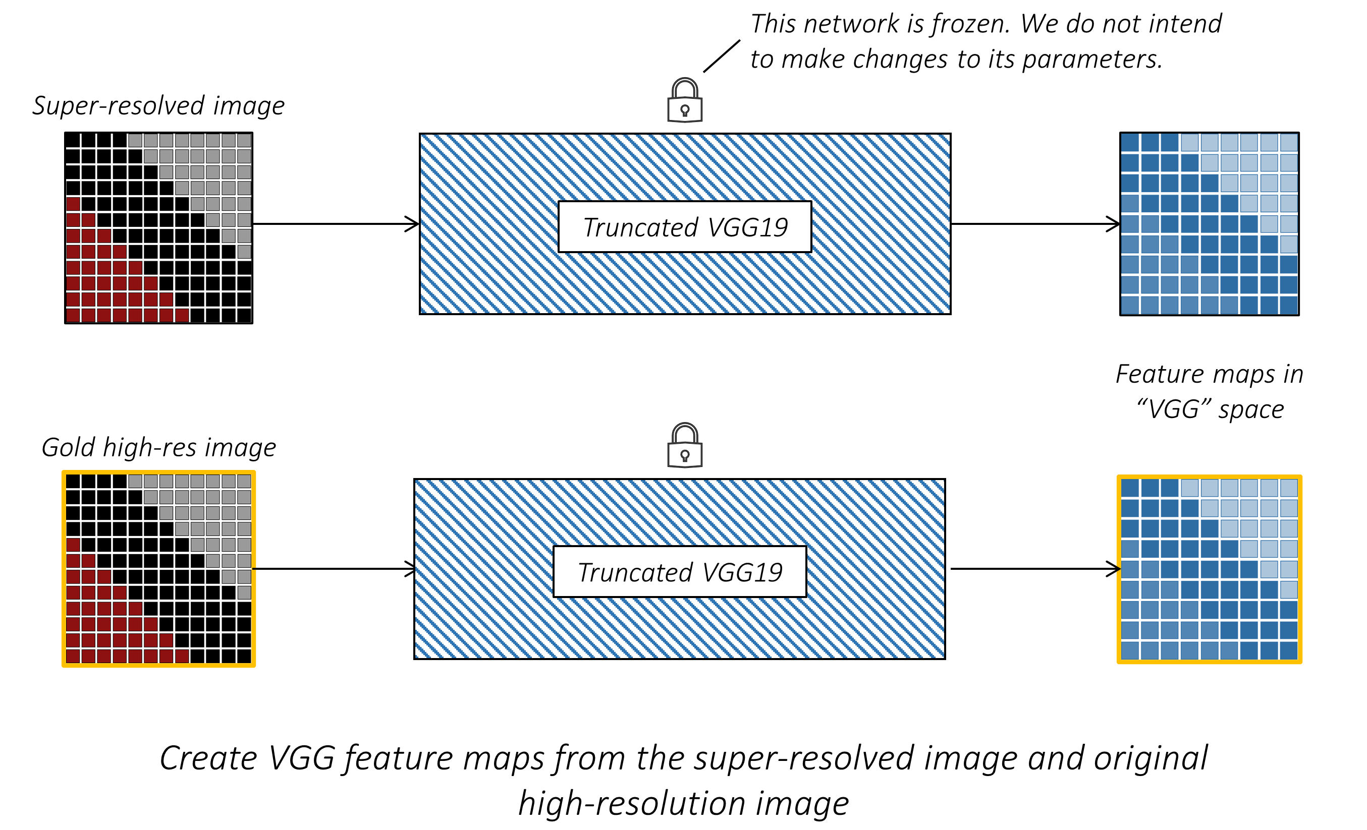该模块截断了一个在 ImageNet 上预训练的 VGG19 网络,该网络可在 torchvision 中找到,使其输出为论文中描述的“VGG19 网络中第 $i$ 个最大池化层之前的第 $j$ 个卷积层(激活后)所得到的特征图”。