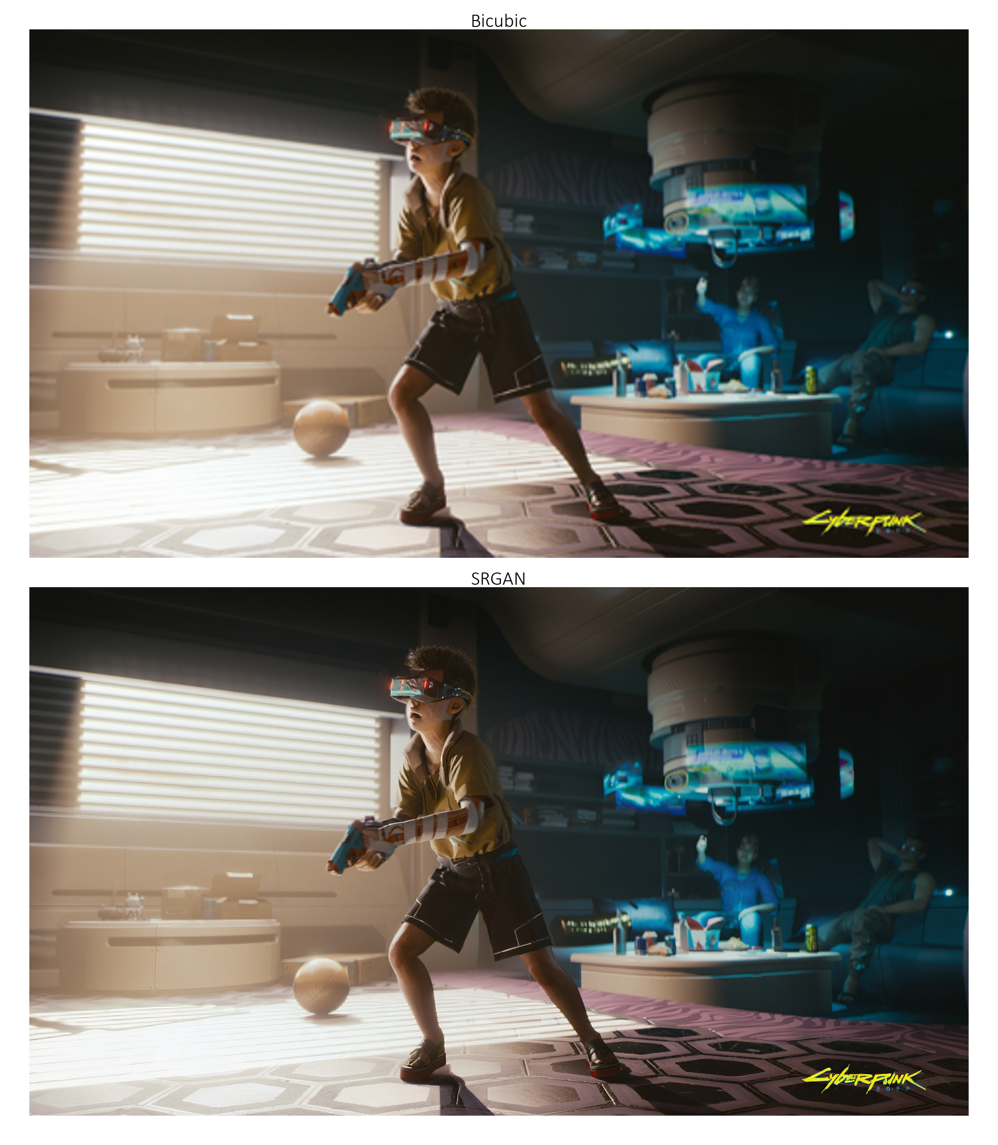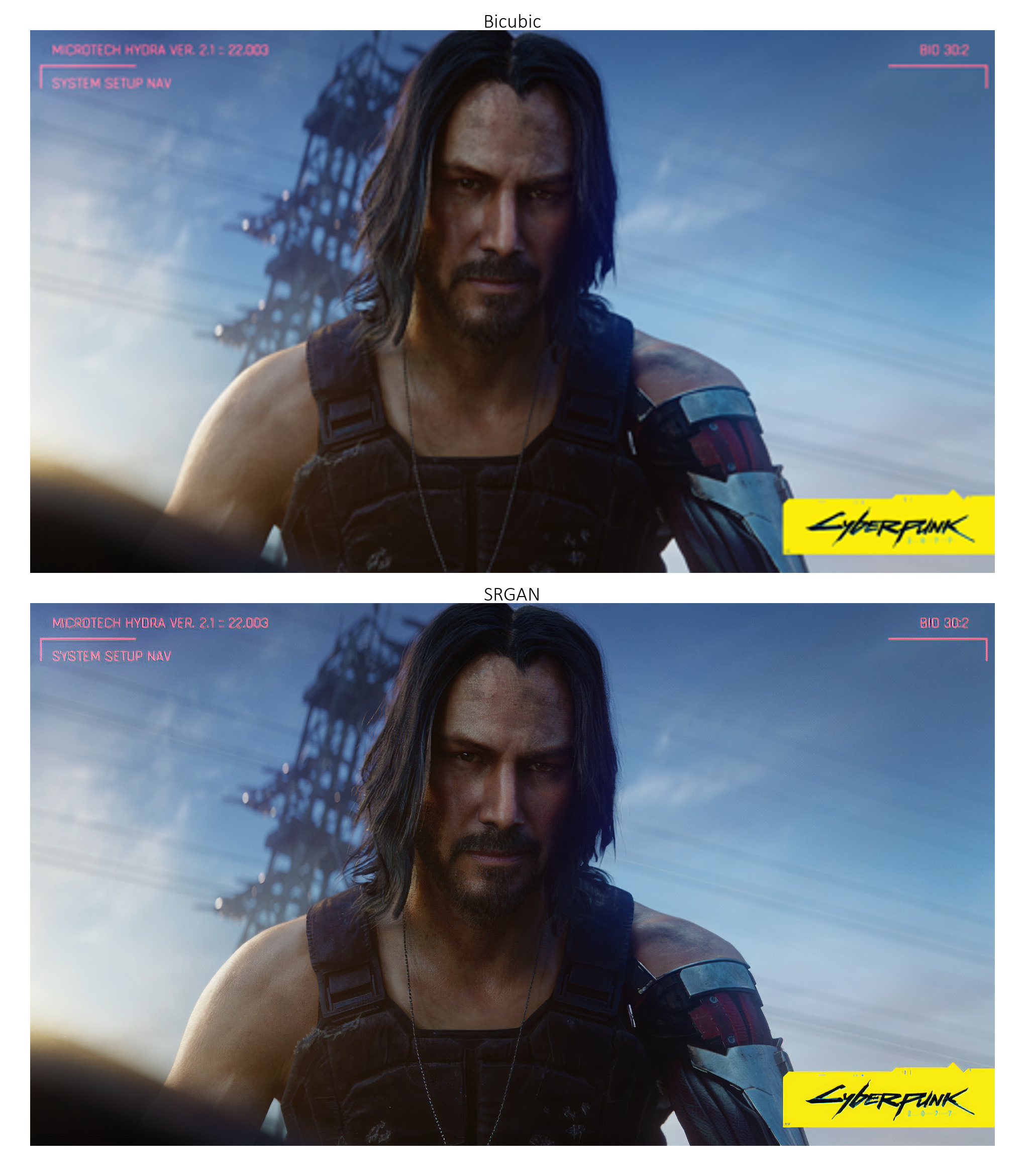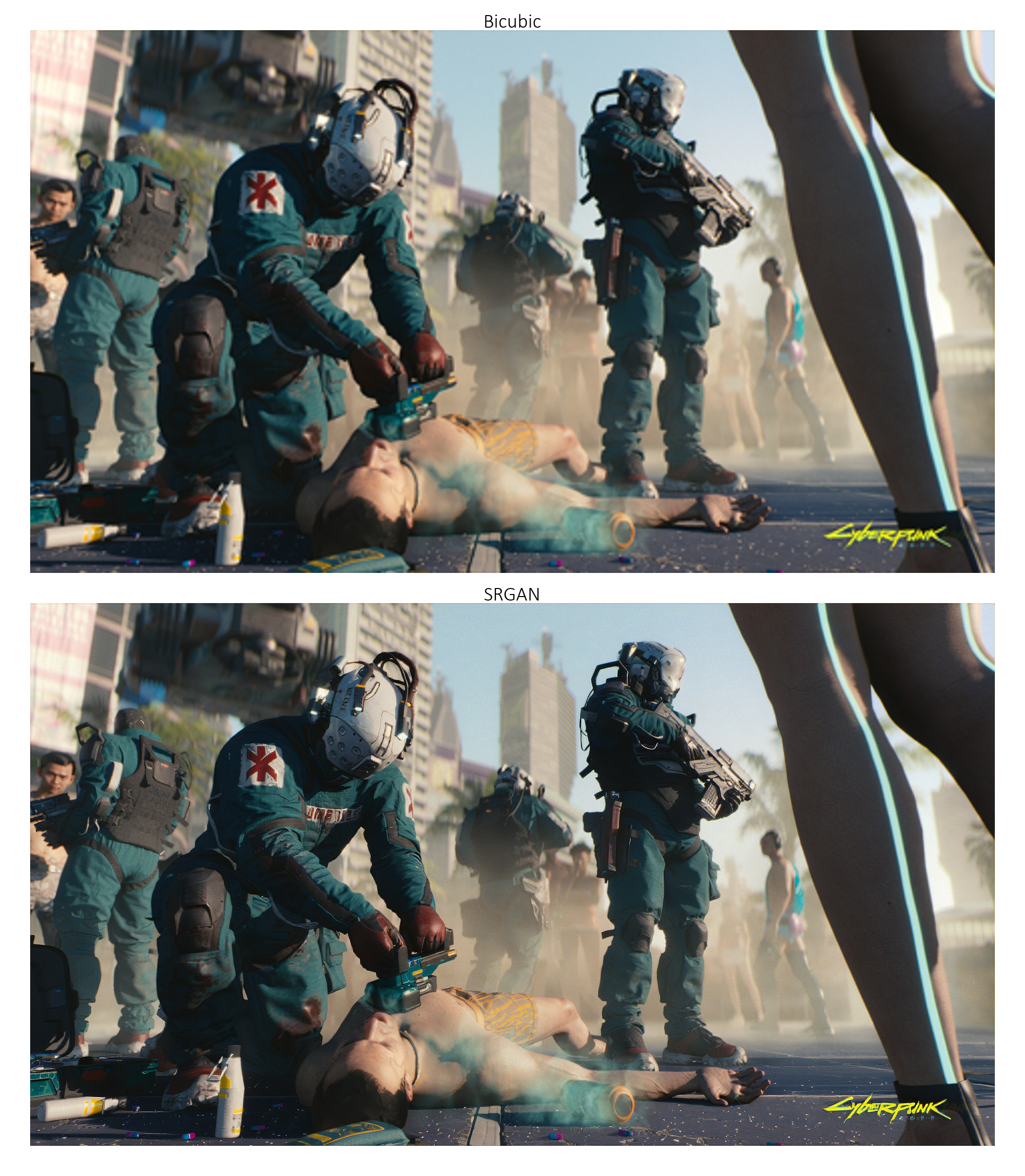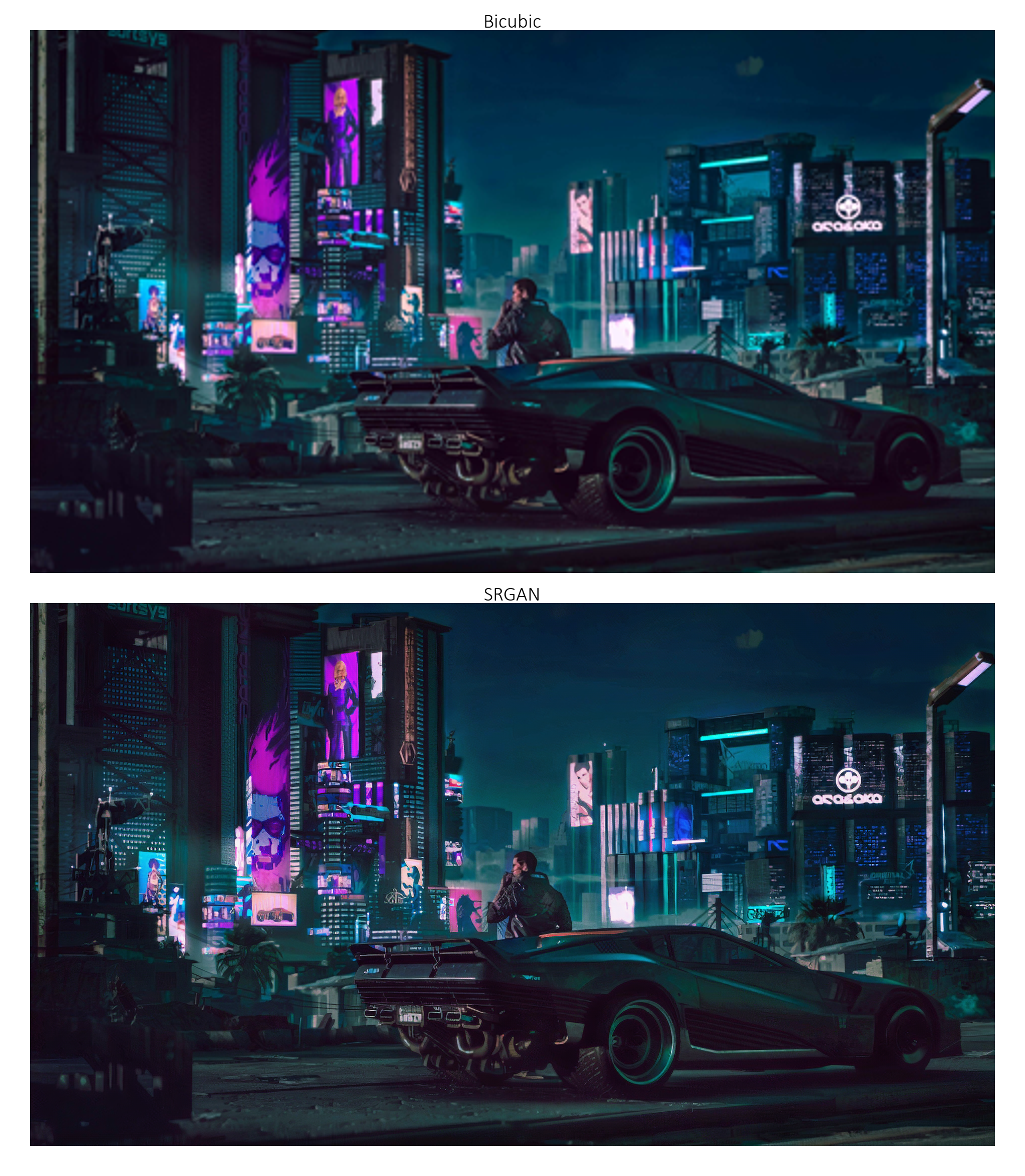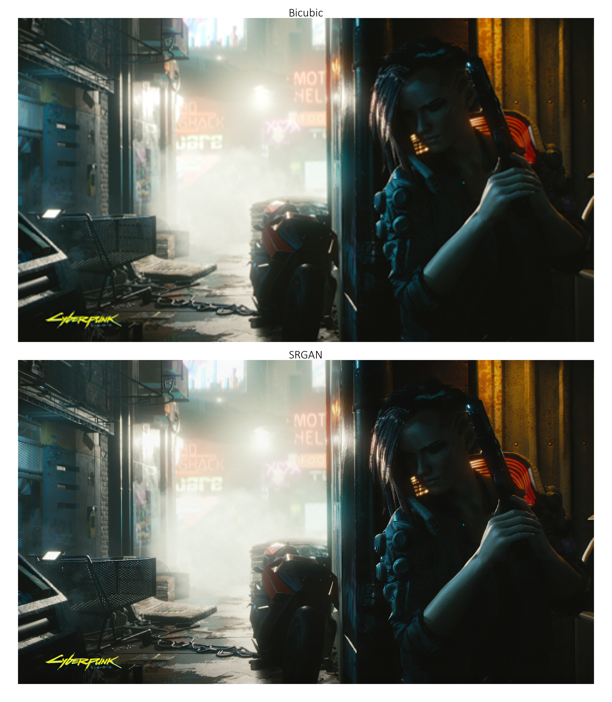 以下示例中的图像(来自《赛博朋克2077》[https://www.cyberpunk.net/in/en/])非常大。如果您是在 1080p 分辨率的屏幕上查看此页面,那么您需要 点击图片以查看其实际尺寸,才能有效地观察到 4 倍超分辨率的效果。