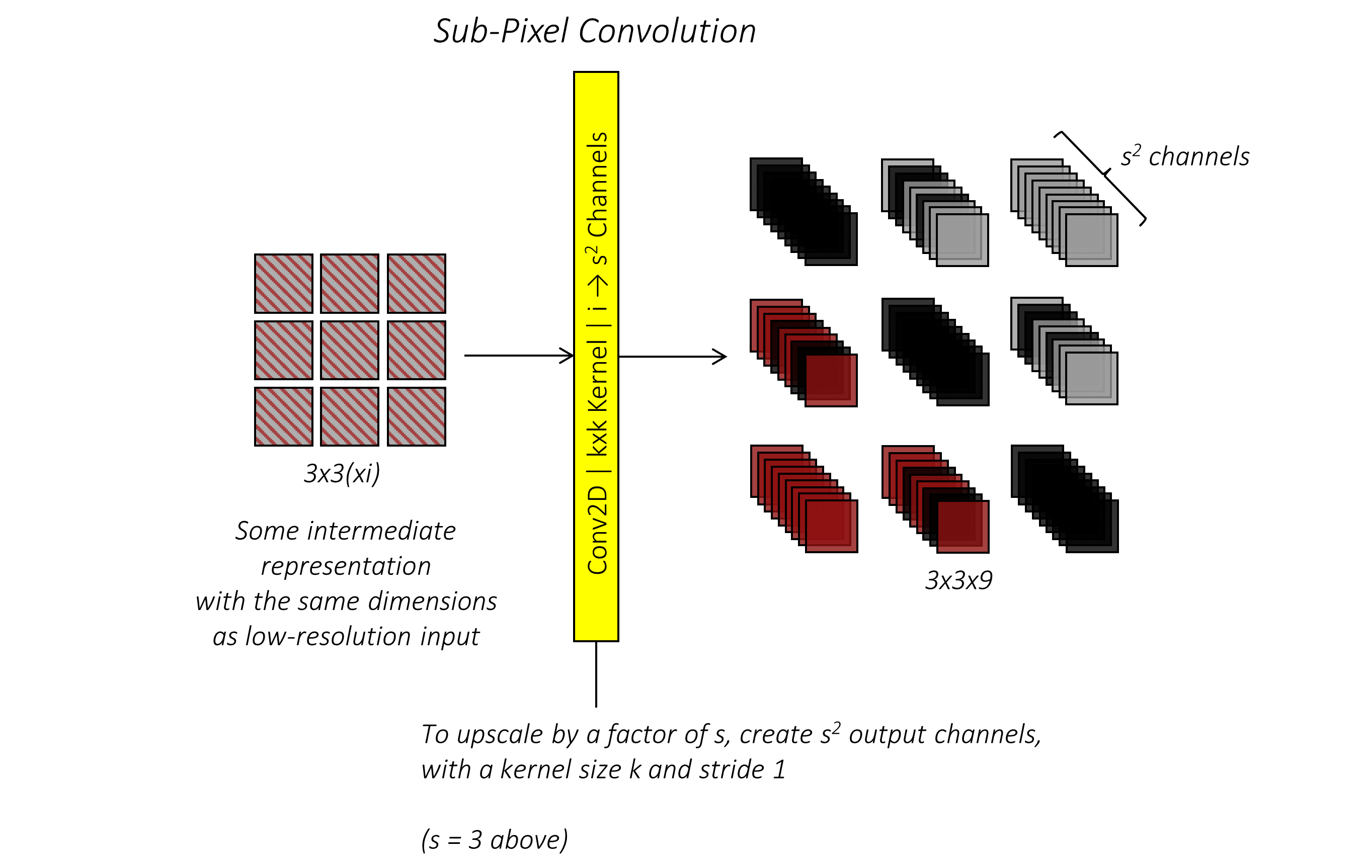 换句话说,如果要将图像上采样 $s$ 倍,那么对于低分辨率图像中的每个像素,需要生成的 $s^2$ 个新像素,就会通过卷积操作以该位置**$s^2$ 个新通道**的形式产生。你可以为这一操作选择任意大小的卷积核 $k$,而低分辨率图像可以具有任意数量的输入通道 $i$。