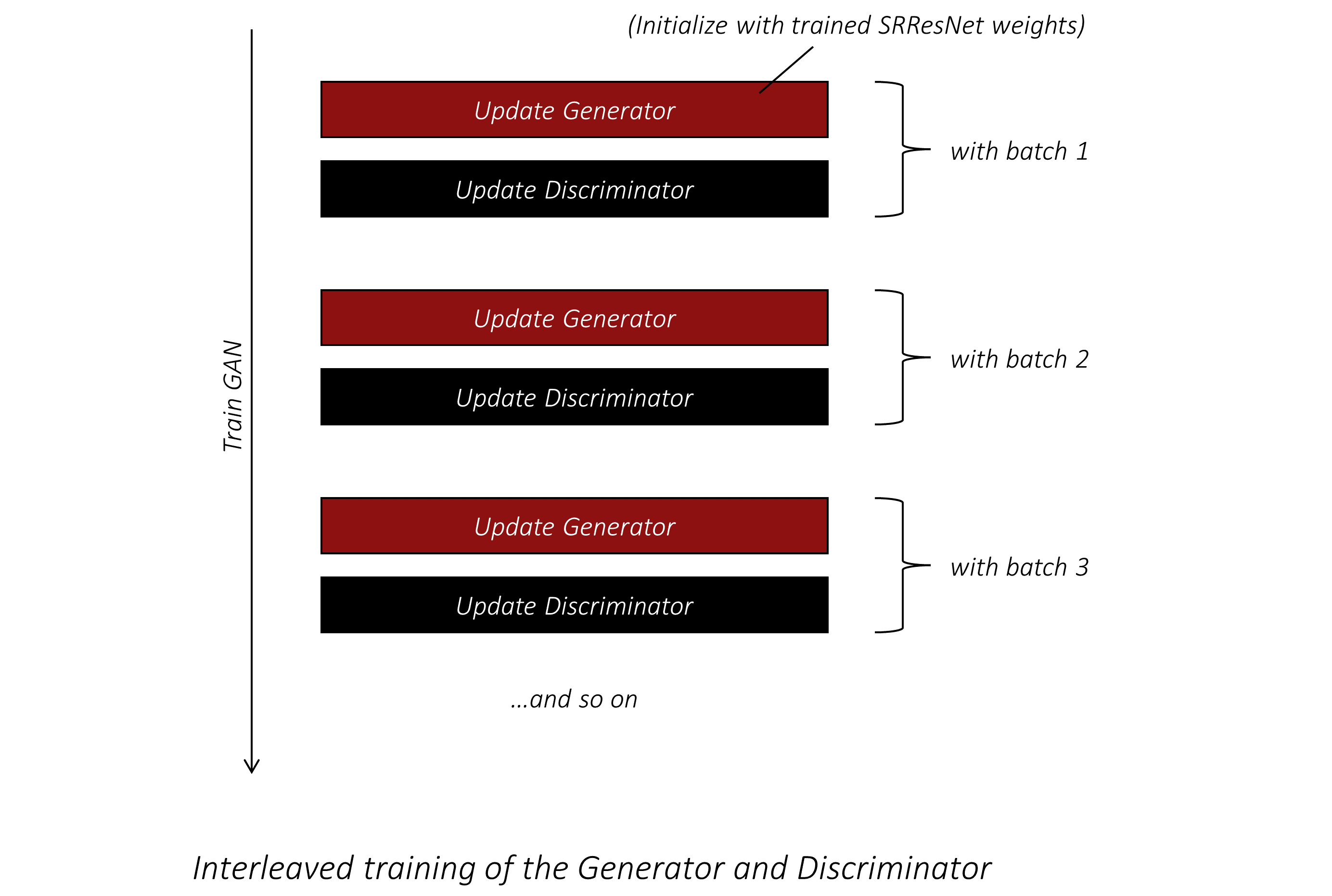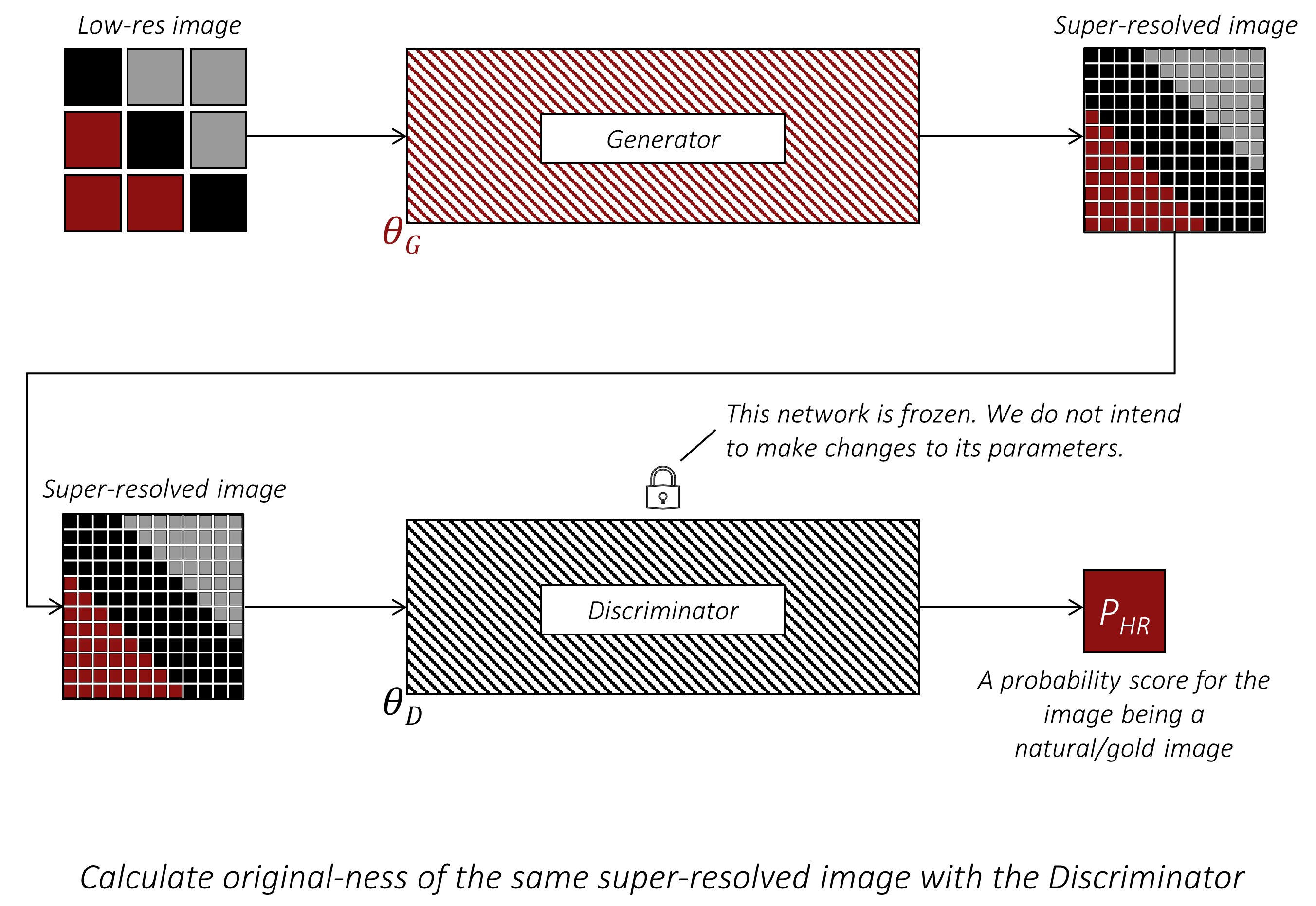换句话说,在训练判别器时,并不需要计算损失函数对 $\theta_G$ 的梯度,生成器也无需参与计算图!如果让生成器继续参与计算图,将会增加不必要的开销,因为反向传播本身是非常耗时的。因此,在第二次前向传播中,我们会将超分辨率图像从计算图中分离出来,使其成为一个独立变量,不再保留任何关于生成它的计算图(即生成器)的记忆。
