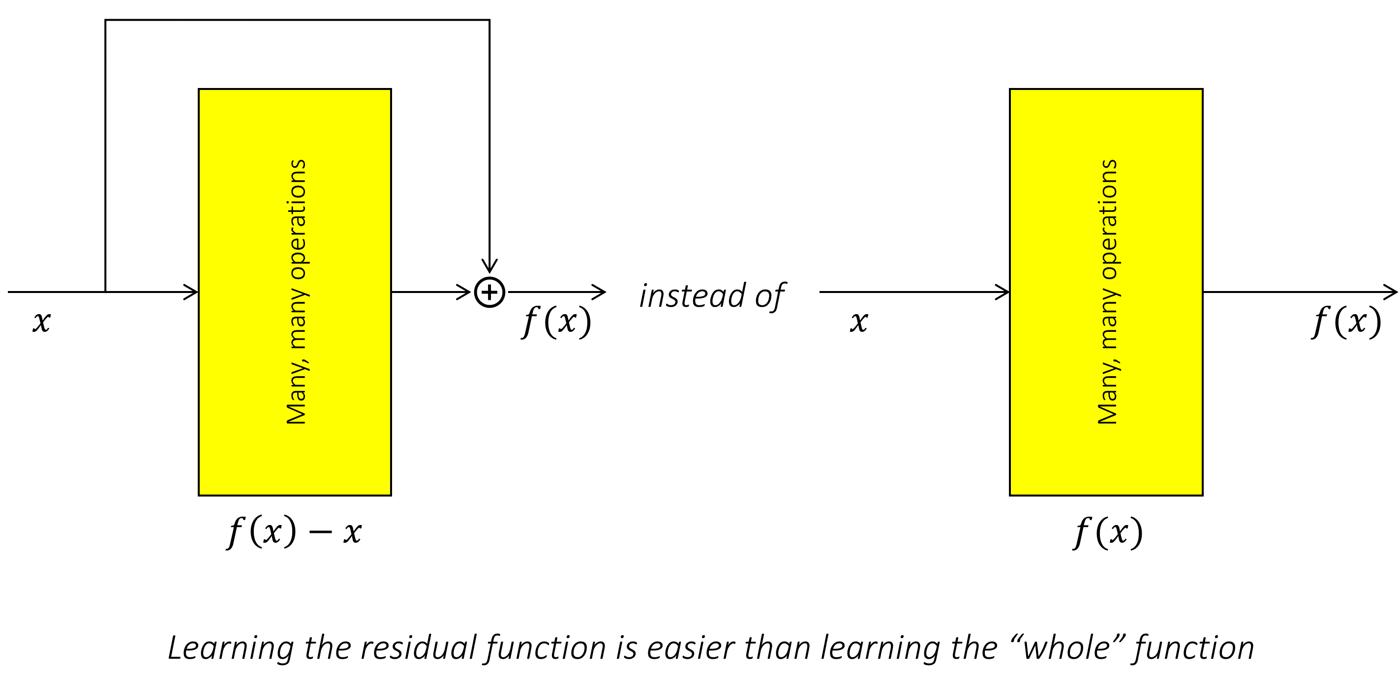 学习残差映射要容易得多。以极端情况为例:让一组非线性层学习“恒等映射”。乍一看似乎很简单,但实际上,找到合适的权重组合——使输入经过线性变换后,再通过非线性激活仍能恢复原状——并非易事,近似求解也绝非轻而举。相比之下,学习其残差映射则要简单得多:只需将权重调整为零即可,因为此时对应的映射就是“零函数”,即不对输入做任何改变。