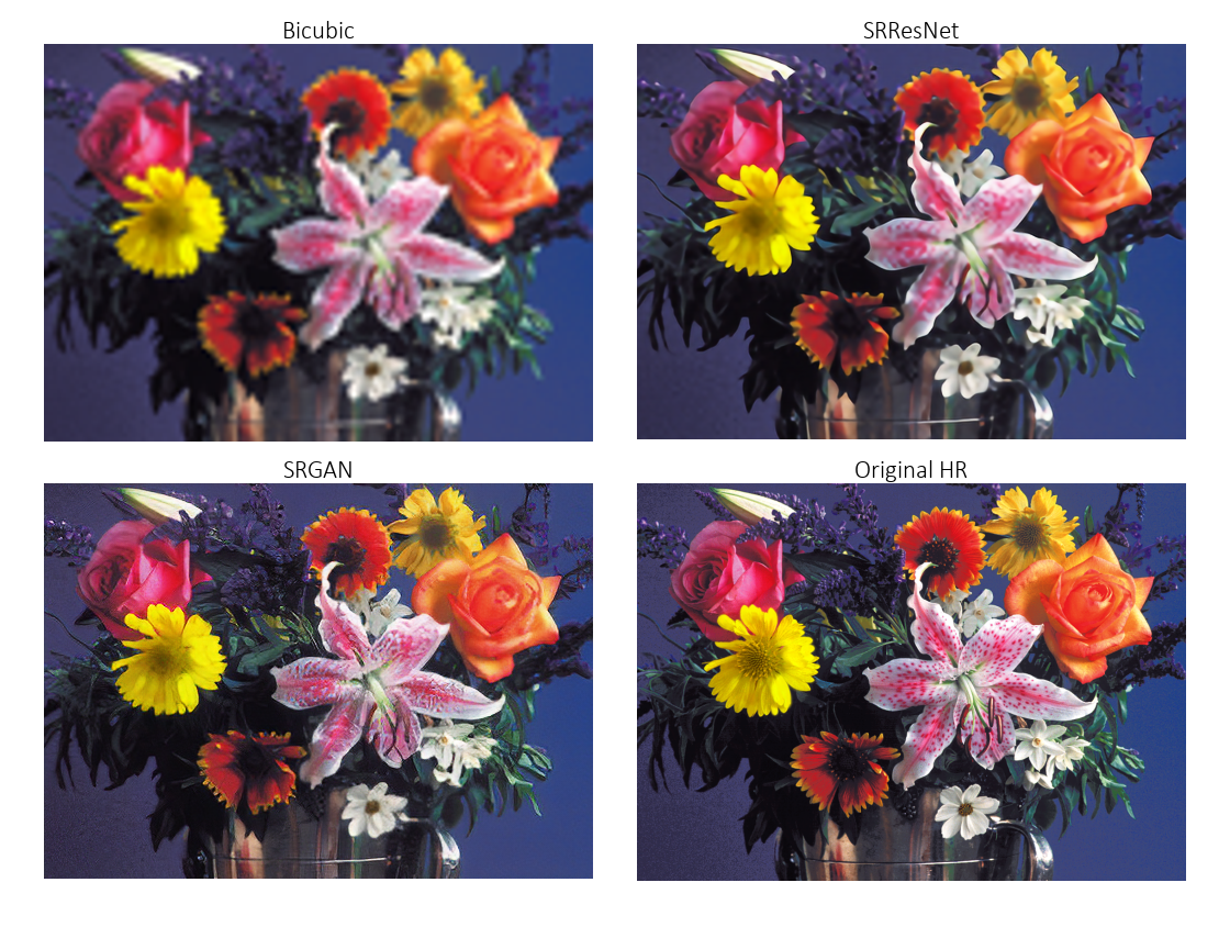 事实上,通过这些方法上采样的图像可以作为低分辨率图像的替代品,用来与超分辨率后的版本进行对比,无论是在论文中还是在本教程中都是如此。如果不以某种方式对低分辨率图像进行上采样(或者反过来对超分辨率图像进行下采样,这显然很荒谬),就无法将低分辨率图像以与超分辨率图像相同的物理尺寸(例如在屏幕上以英寸为单位)显示出来。
