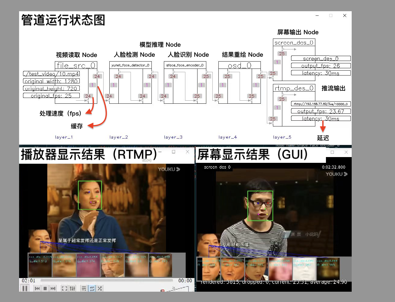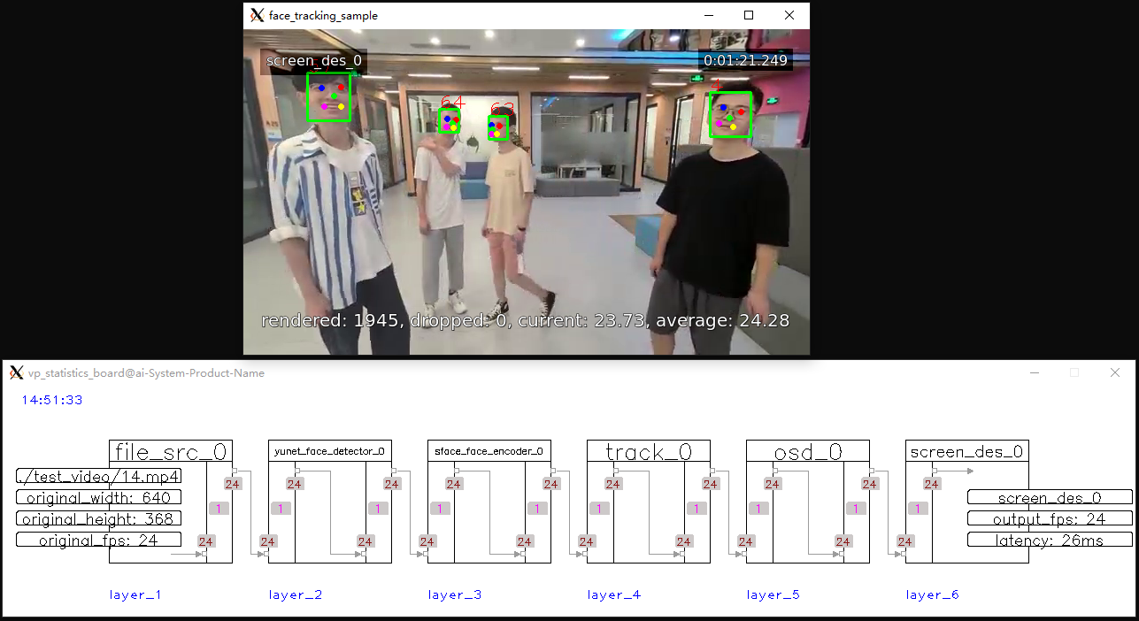 * 功能:1 路视频输入,1 项视频分析任务(人脸检测与识别),2 路输出(屏幕显示/RTMP 流)