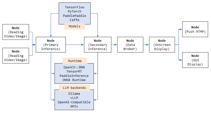 VideoPipe 采用插件化的编程风格,可根据不同需求灵活配置。我们可以通过独立的插件(在框架中称为“Node”类型)来构建各种类型的视频分析应用。用户只需准备好模型并了解其输出解析方式即可。推理部分可使用不同的后端实现,例如 OpenCV::DNN(默认)、TensorRT、PaddleInference、ONNXRuntime,或任何其他您偏好的后端。