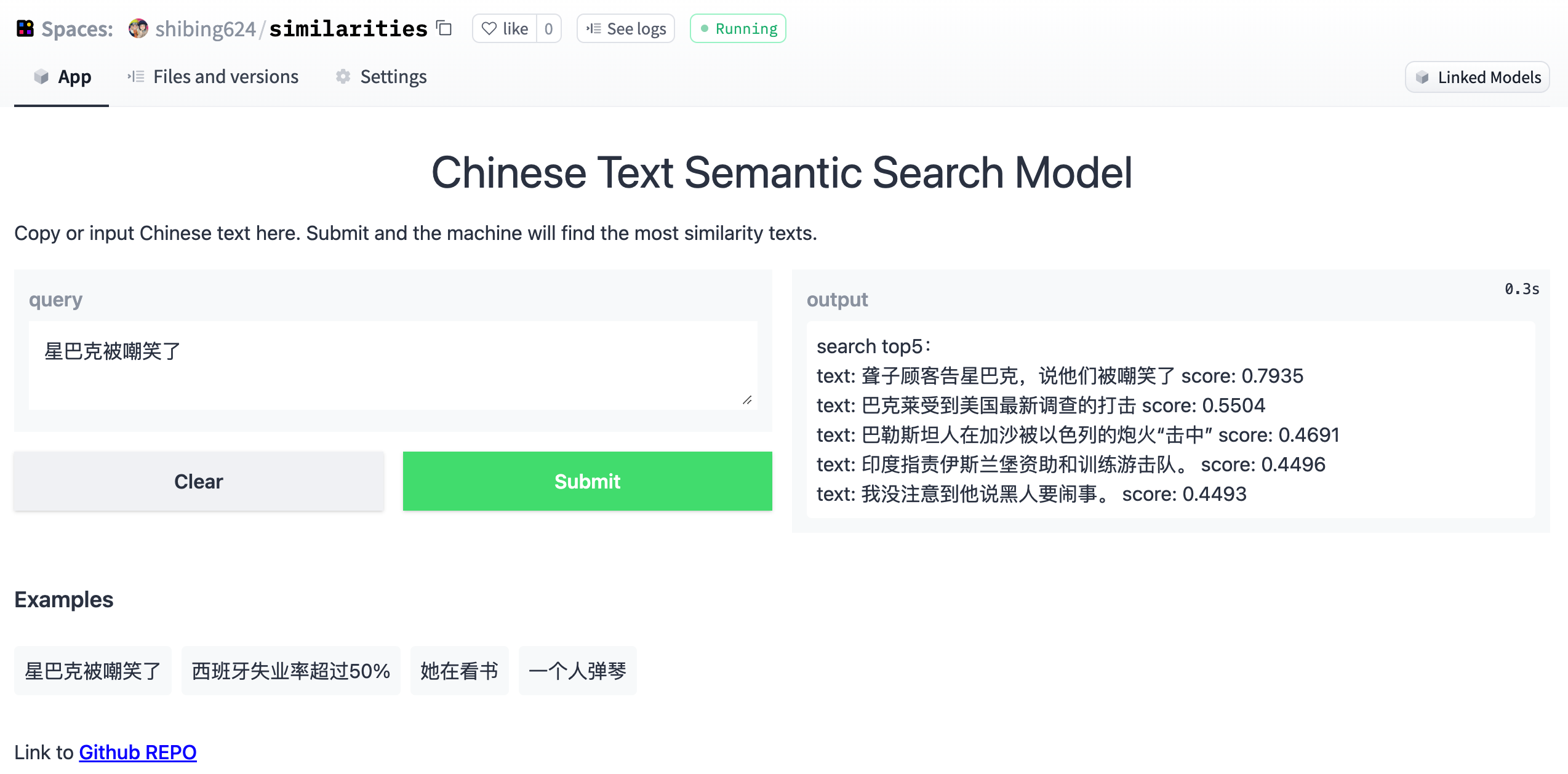 文本搜索演示:https://huggingface.co/spaces/shibing624/similarities