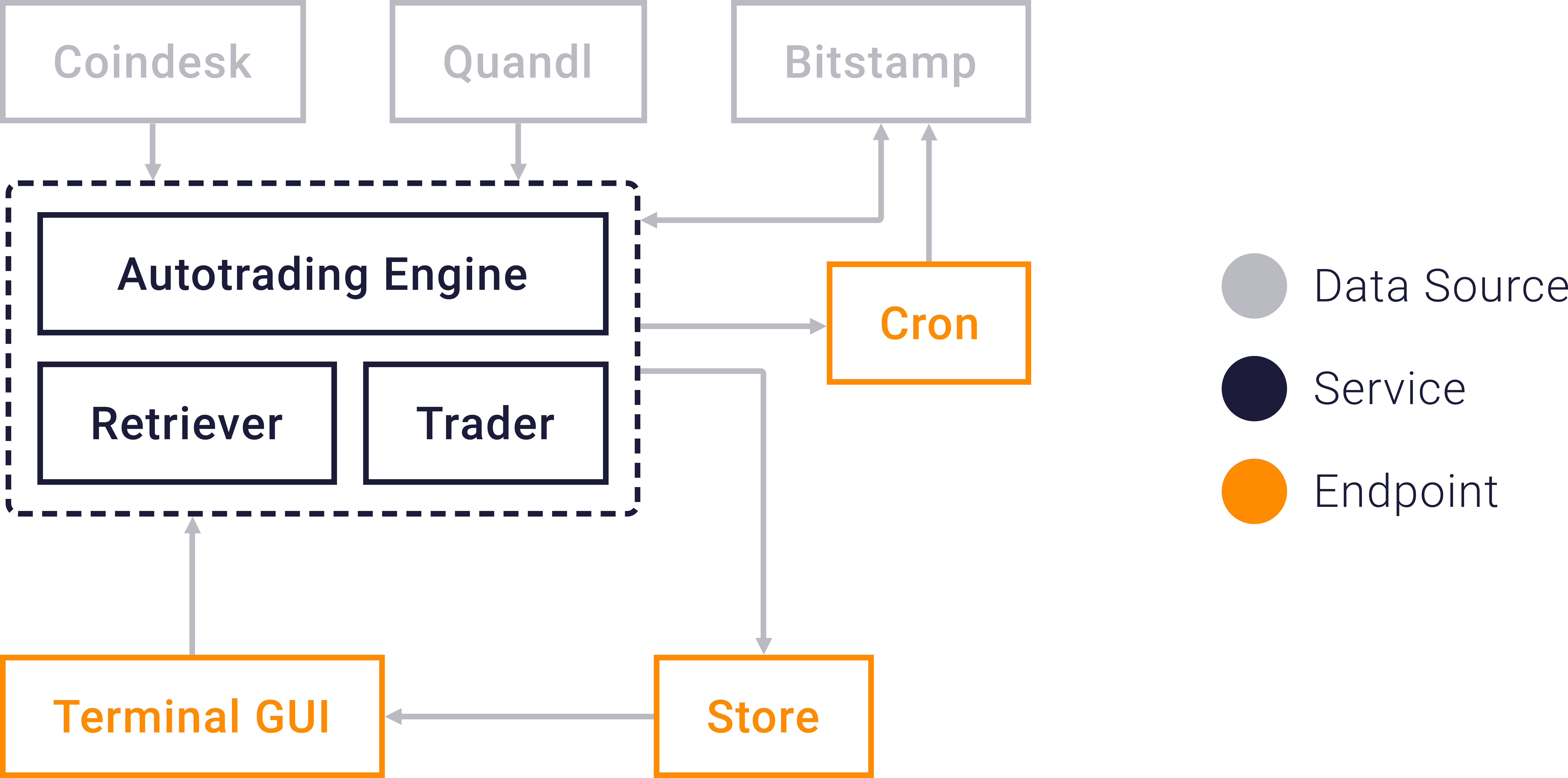 服务被组织成三个模块:数据获取模块、交易模块和自动化交易引擎。其中,“数据获取模块”从 Bitstamp 获取行情数据、投资组合数据和交易历史;从 Quandl 获取区块链数据(算力、难度等);以及从 Coindesk 获取比特币相关新闻头条。“交易模块”封装了 Bitstamp 的 REST API,负责验证用户凭证、执行买入或卖出订单,以及切换自动交易模式。最后,“自动化交易引擎”是一个机器学习系统,旨在预测次日比特币价格的涨跌方向,并据此进行交易。
