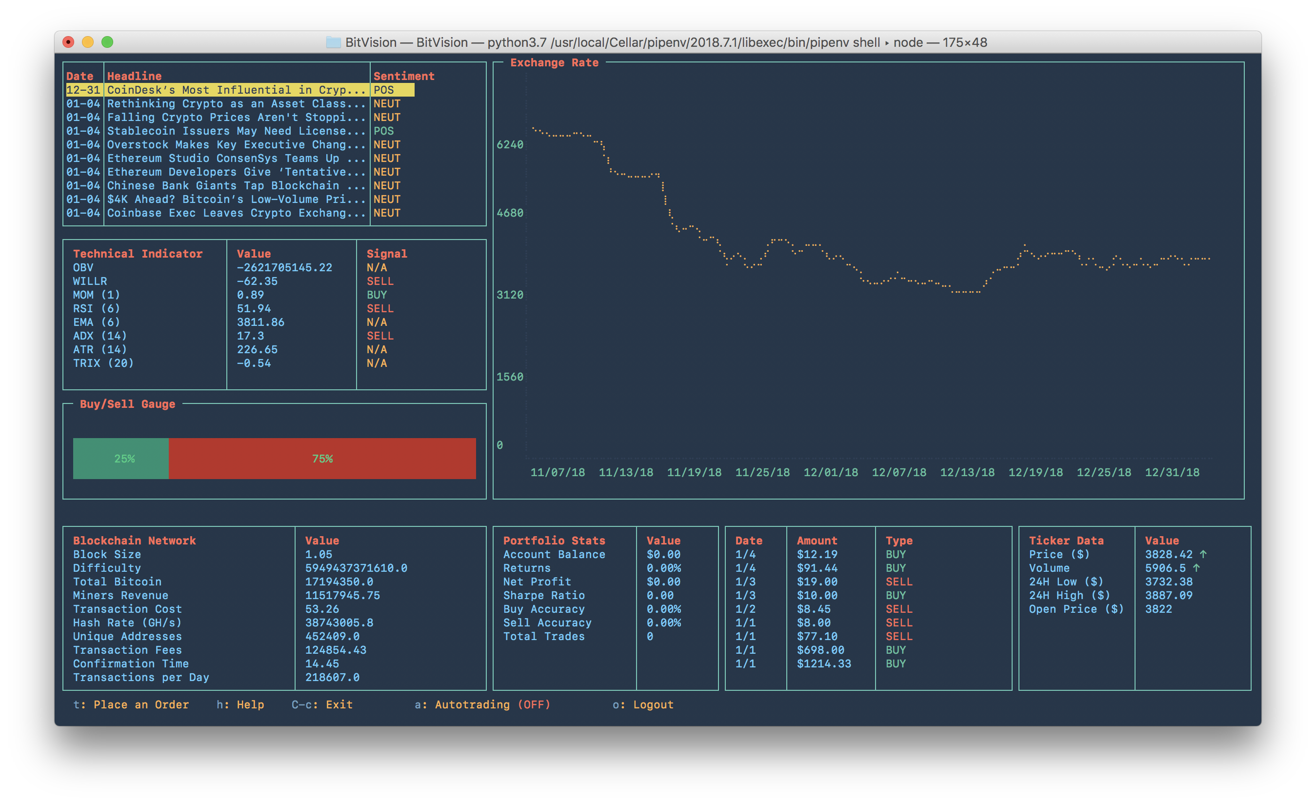该工具特别适合熟悉命令行操作的开发者、量化交易爱好者以及希望轻量级监控市场的研究人员。通过 BitVision,用户不仅能查看每日汇率走势、实时新闻和技术指标,还能利用内置的机器学习模型预测价格波动,执行风险调整的自动交易策略。系统会自动记录交易历史、账户余额及投资组合表现(如夏普比率),并支持手动下单与自动交易的灵活切换。