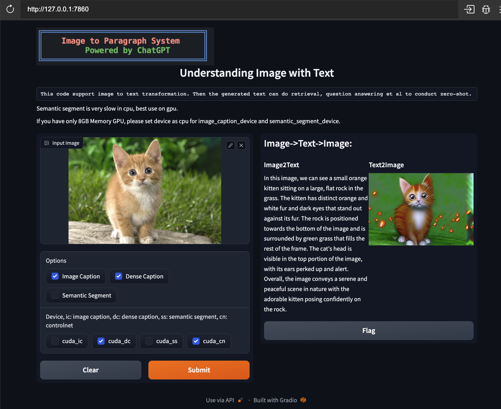 技术亮点方面,它在性能优化上表现突出,仅需 8GB 显存的显卡即可在 20 秒内完成推理,甚至支持纯 CPU 环境运行。此外,它还具备反向生成能力,能根据生成的文本段落配合 ControlNet 还原或创作新的图像。无论是用于数据增强、图像检索还是创意写作辅助,Image2Paragraph 都能提供可靠且高效的解决方案。