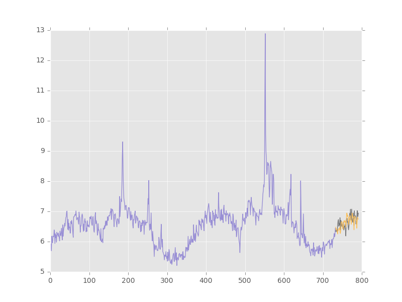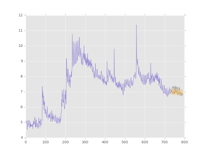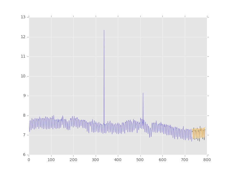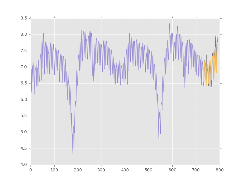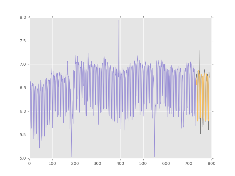 以下是一些示例预测,展示了网络可以捕捉到的一些模式。预测值以黄色显示,真实值(未用于训练或验证)以灰色显示。纵轴经过对数变换。
