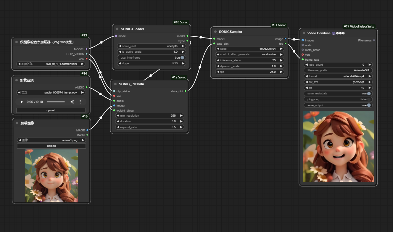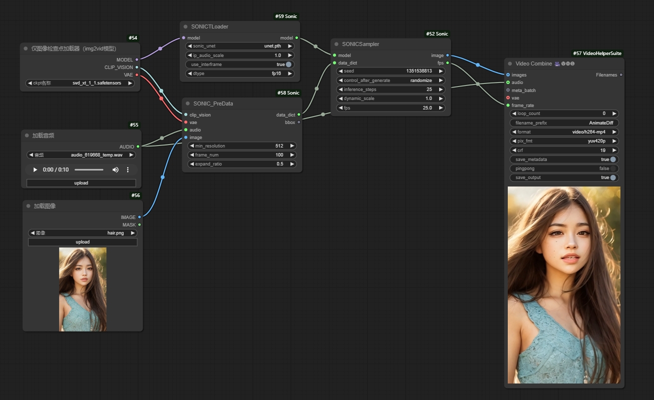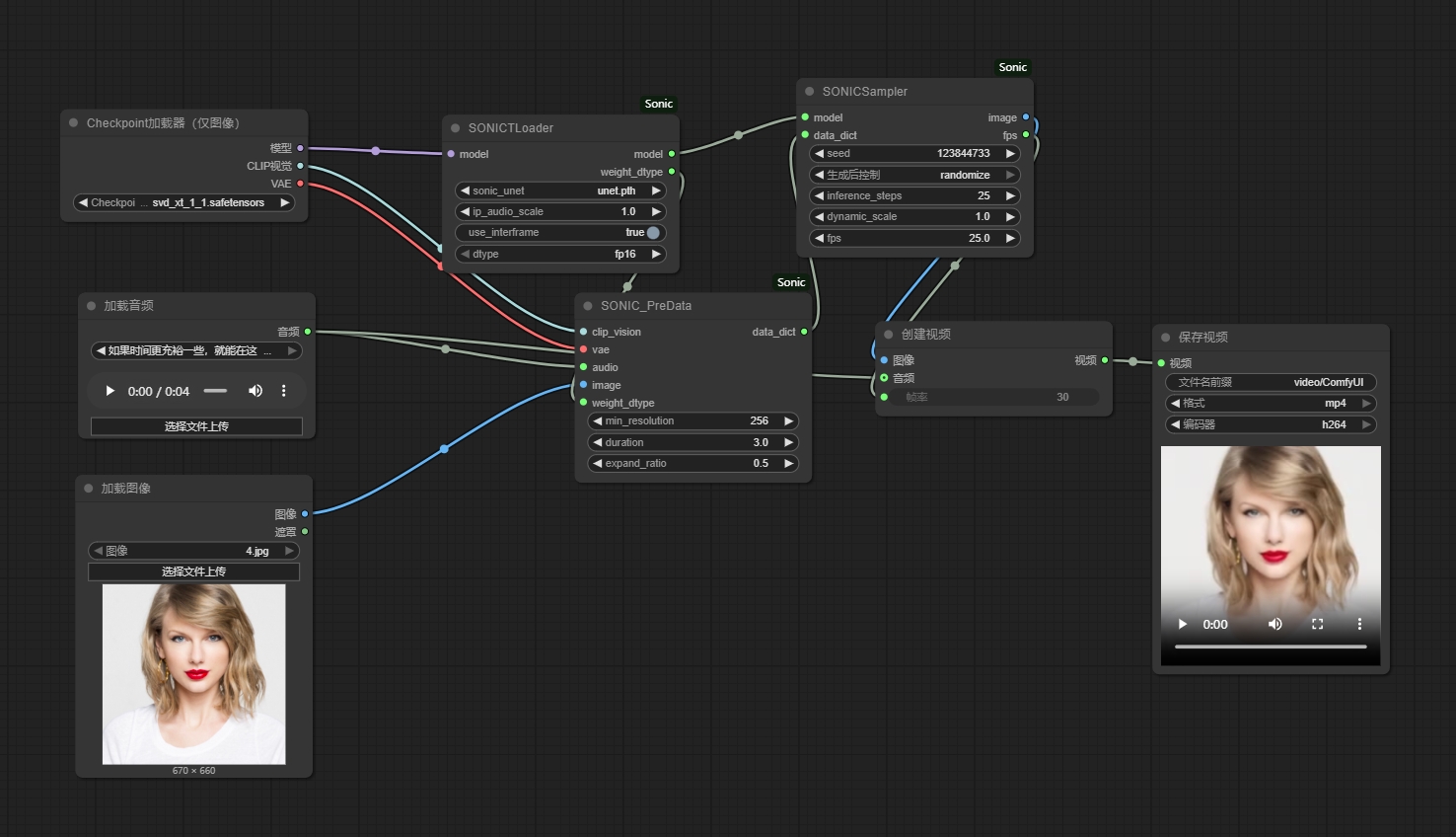 Sonic 是一种关于“在人像动画中将注意力转移到全局音频感知”的方法,你可以在 ComfyUI 中使用它。