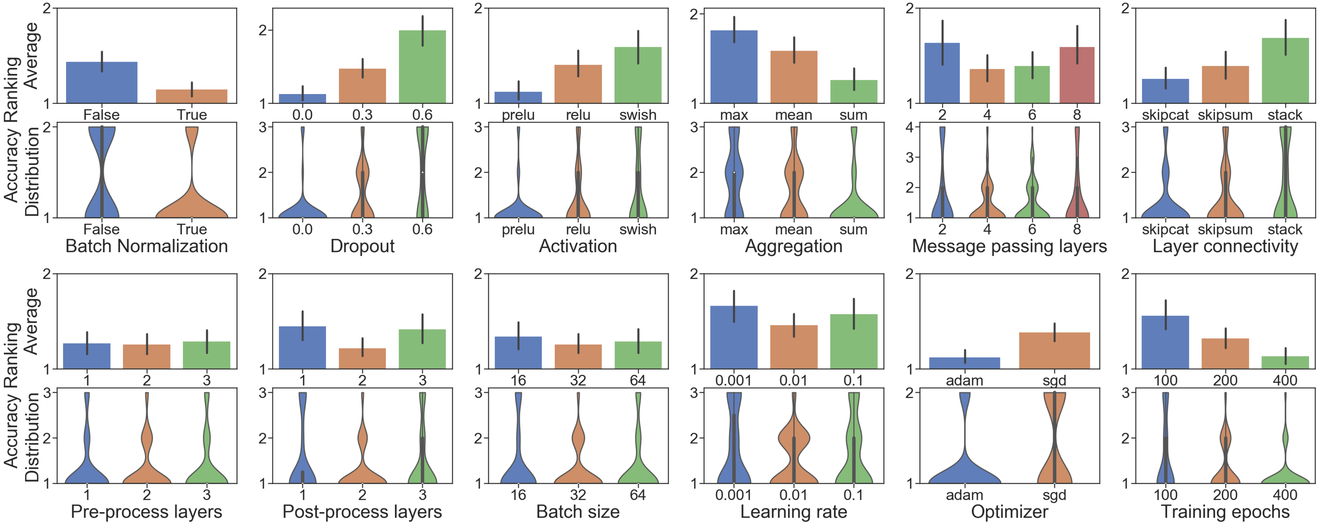 图 3: 对给定 GNN 设计维度的评估(此处以 BatchNorm 为例)。
