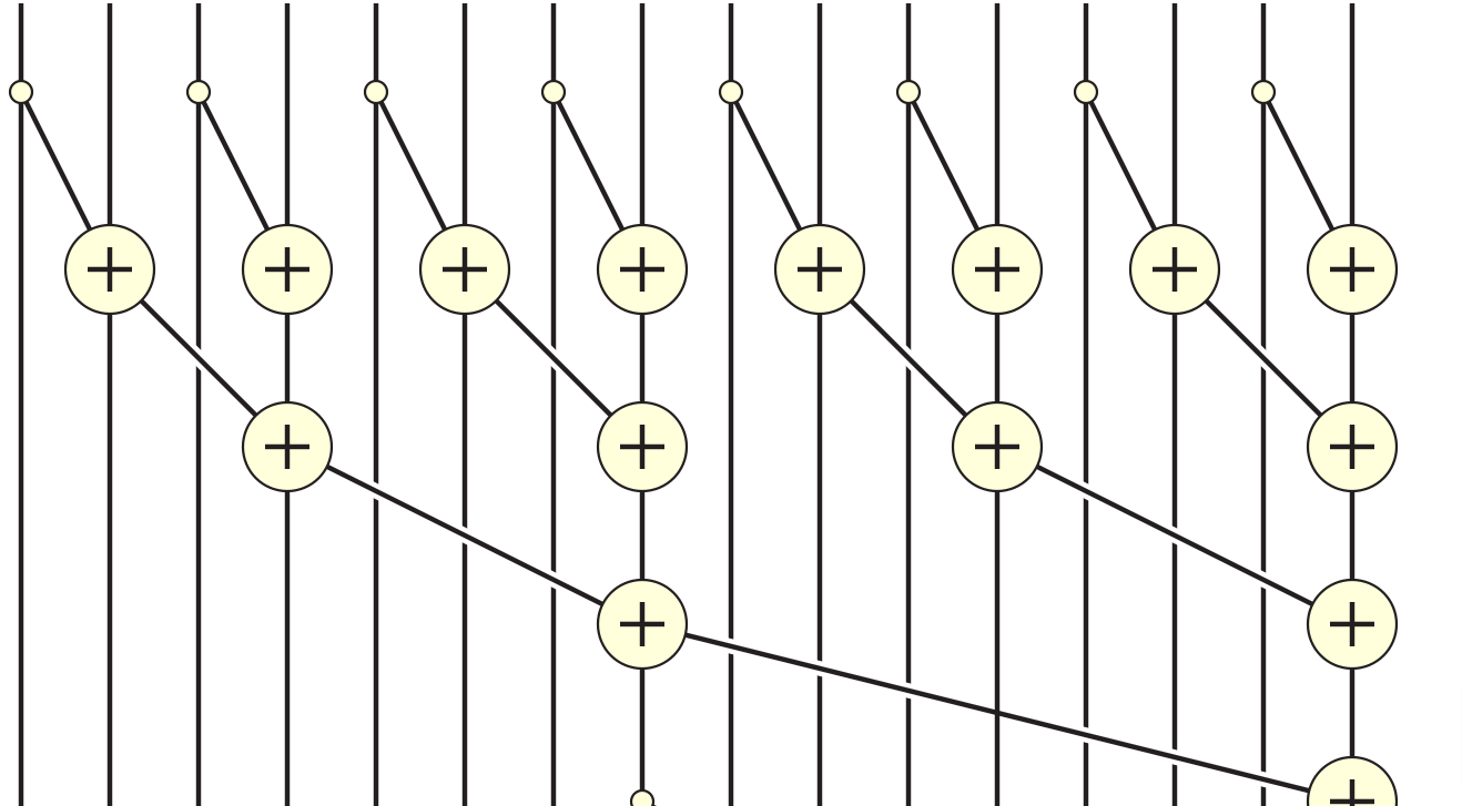 我们将使用共享内存中的并行前缀和算法来实现这一点。 也就是说,算法的每一步都应该将剩余数字的一半相加。请按照下图所示进行操作: