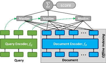 图 1: ColBERT 的晚期交互机制,高效地计算查询与段落之间的细粒度相似度。