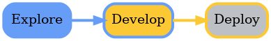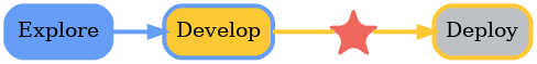 本仓库中的代码具有明确的观点和风格,既不完全适合直接投入生产环境,也不仅仅是临时性的探索性代码。它介于从探索到部署的连续体之间,目标是从“Hello World”逐步过渡到 CI/CD/CT 流程。在我们的日常数据科学工作中,这一过程可以大致分为以下阶段: