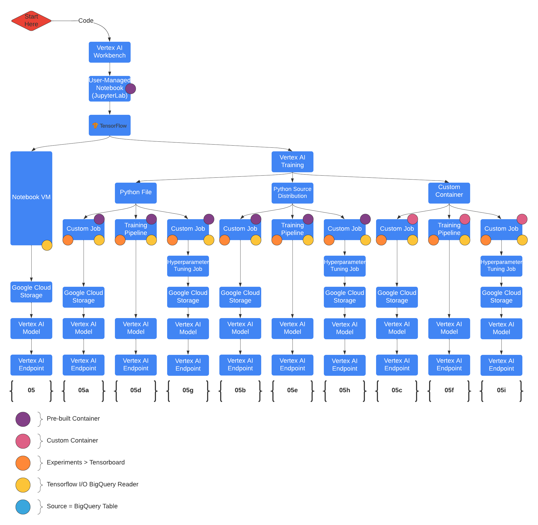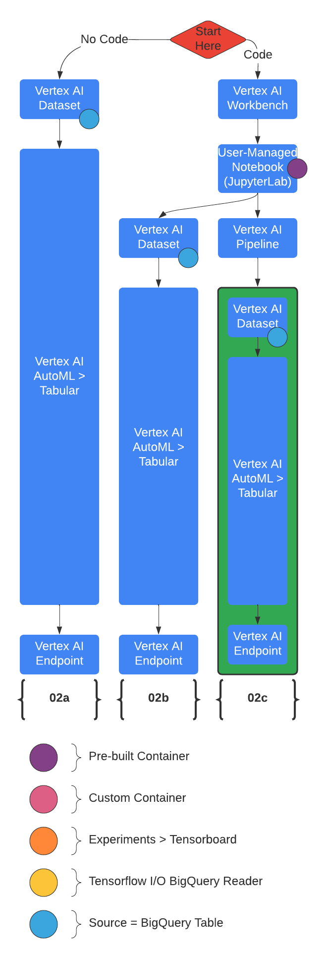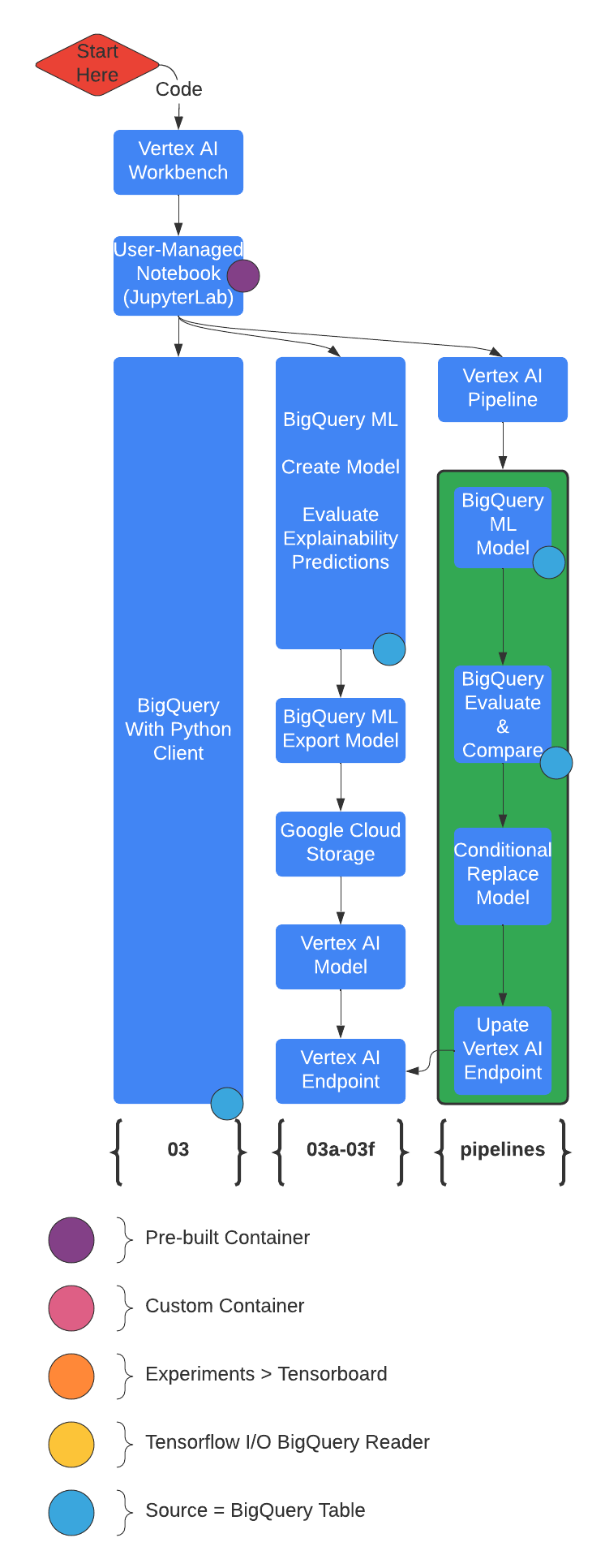 在笔记本中,代码的执行是由本地计算资源驱动的。在本仓库中,这意味着当前的 Python 代码是在笔记本所关联的计算环境中运行的。该仓库中的代码大量依赖于在 GCP 中编排服务,而不是在笔记本所在的本地环境中进行数据计算。因此,这些笔记本被设计为可以在较小的机器规格上运行,例如 n1-standard2 实例。而繁重的训练和推理任务则由 Vertex AI、BigQuery 等 Google Cloud 服务来完成。您甚至会发现一些笔记本不仅编写代码,还会将代码部署到 Vertex AI 自定义训练和 Vertex AI 流水线等服务中。