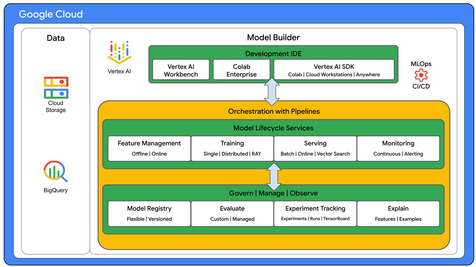Vetex AI 是一个端到端的模型开发平台。它由核心组件组成,这些组件使各种设计模式下的 MLOps 流程成为可能。