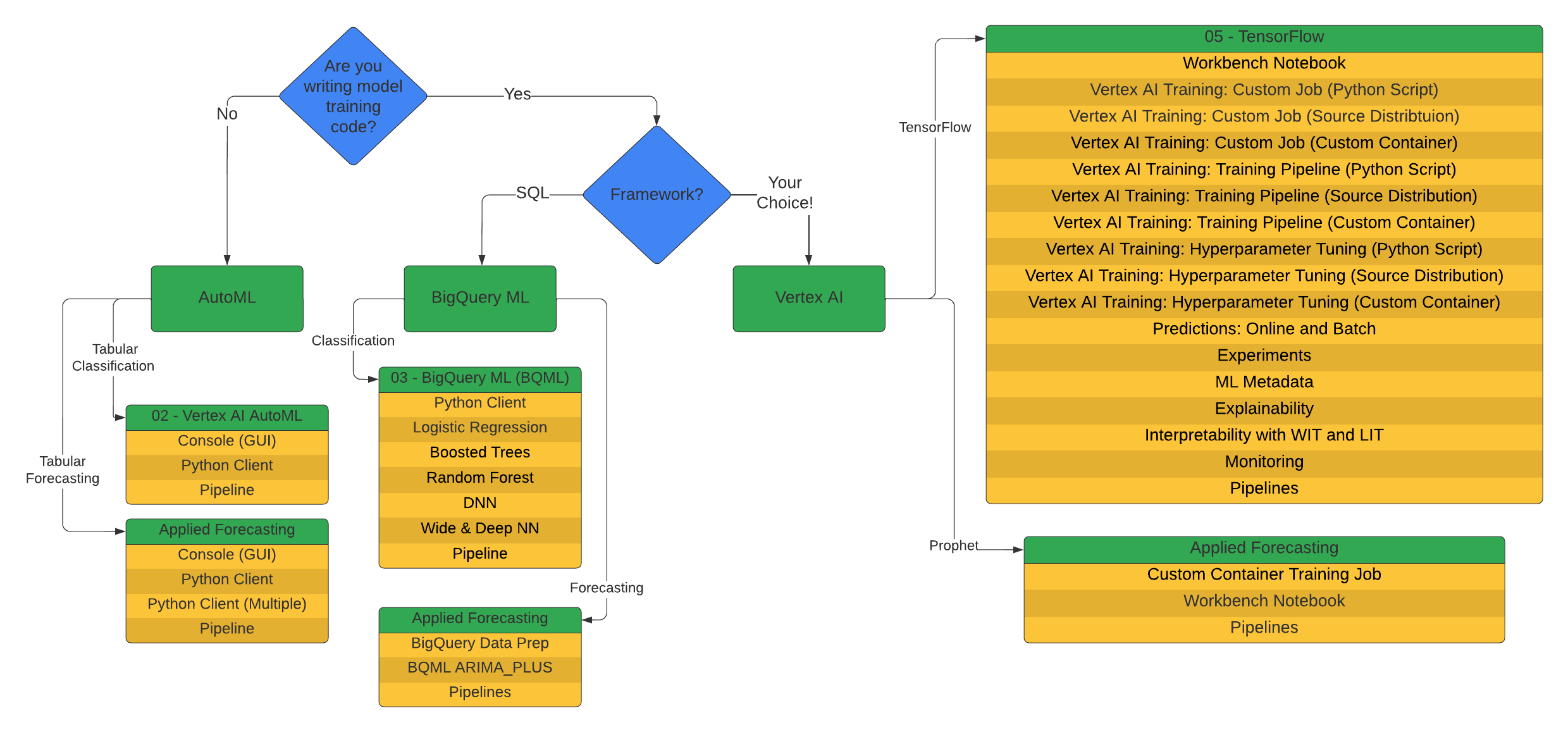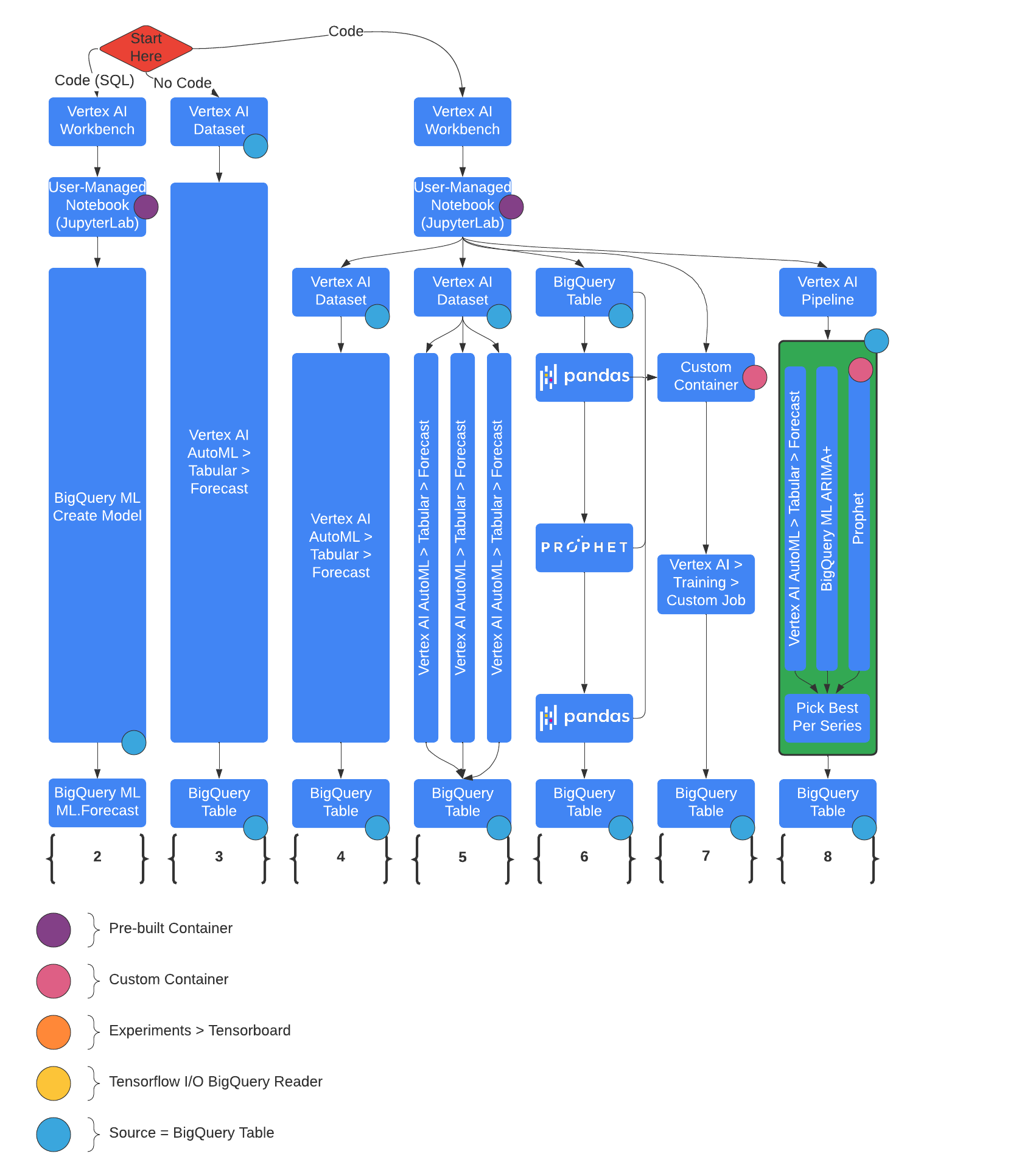 | AutoML | BigQuery ML | Vertex AI | 使用 AutoML、BigQuery ML 和开源 Prophet 进行预测 |