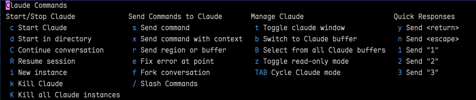 您可以通过调用瞬态菜单 claude-code-transient (C-c c m) 来查看重要命令列表: