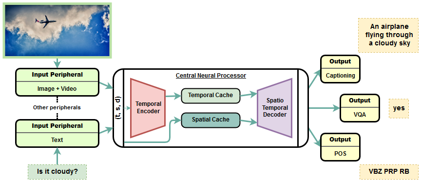 OmniNet 是一种用于多模态多任务学习的统一且扩展版 Transformer 架构。单一的 OmniNet 架构可以编码来自几乎任何现实世界领域的多种输入(文本、图像、视频),并能够在广泛的任务范围内进行异步多任务学习。OmniNet 架构由多个称为神经外设的子网络组成,这些子网络用于将特定领域的输入编码为时空表示,并连接到一个名为中央神经处理器(CNP)的通用中央神经网络。CNP 实现了一个基于 Transformer 的通用时空编码器和一个多任务解码器。