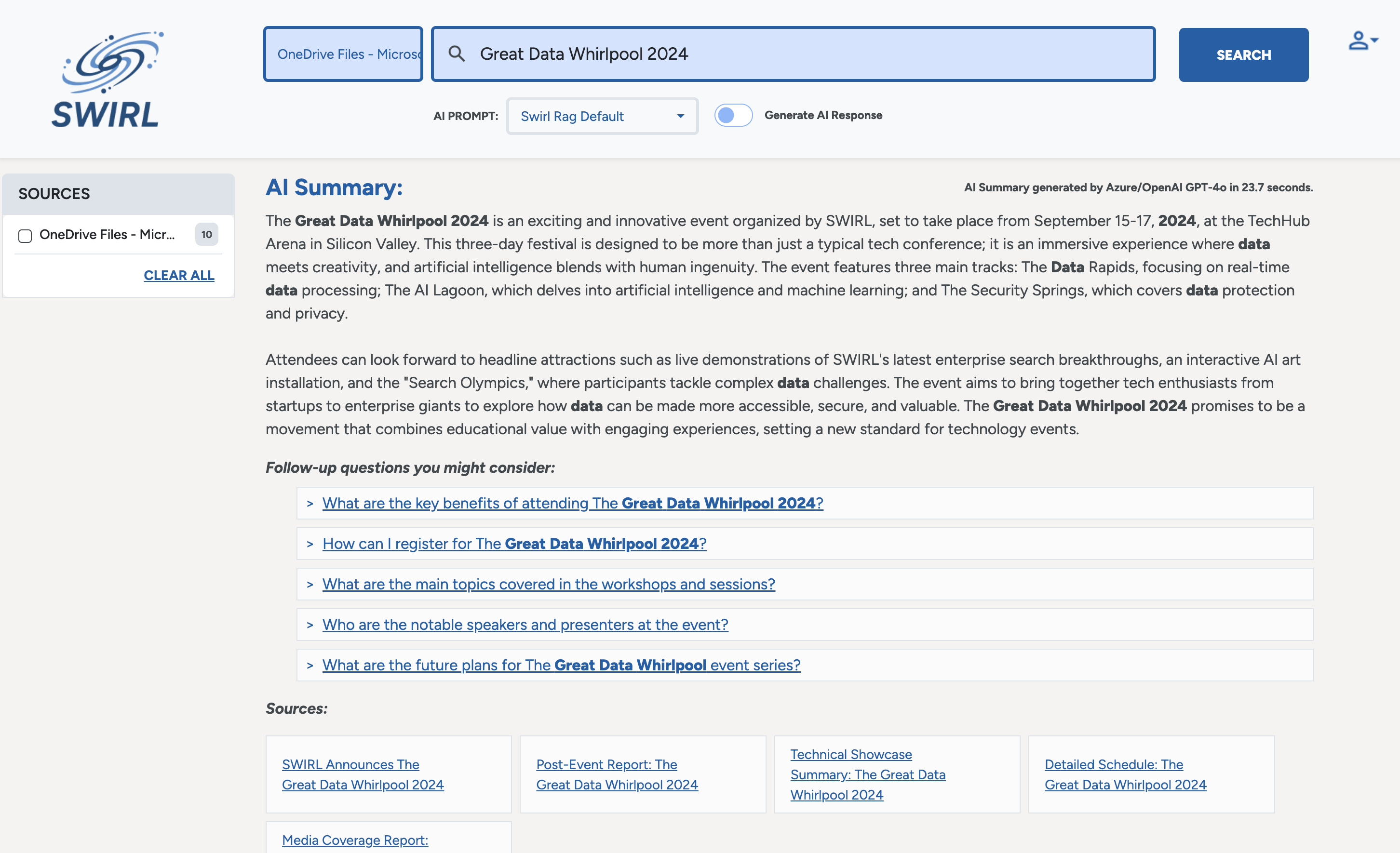 swirl-search 是一款专为企业管理知识打造的 AI 搜索与检索增强生成(RAG)工具。它的核心使命是让团队在不移动任何数据的前提下,安全地利用分布在 100 多种企业应用(如 Microsoft 365、SharePoint、Confluence、GitHub 等)中的私有数据,即时获取带有来源引用的精准答案。