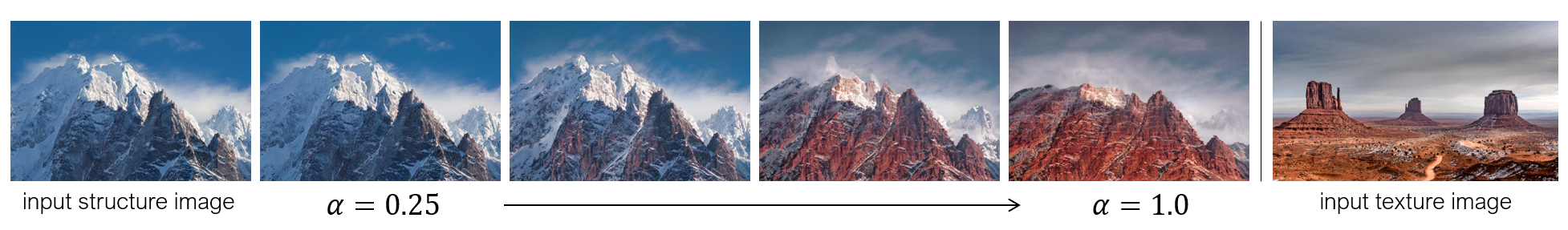 要运行简单的交换和插值操作,需指定两幅参考图像,修改 experiments/mountain_pretrained_launcher.py 中的 input_structure_image 和 input_texture_image 字段,然后运行: