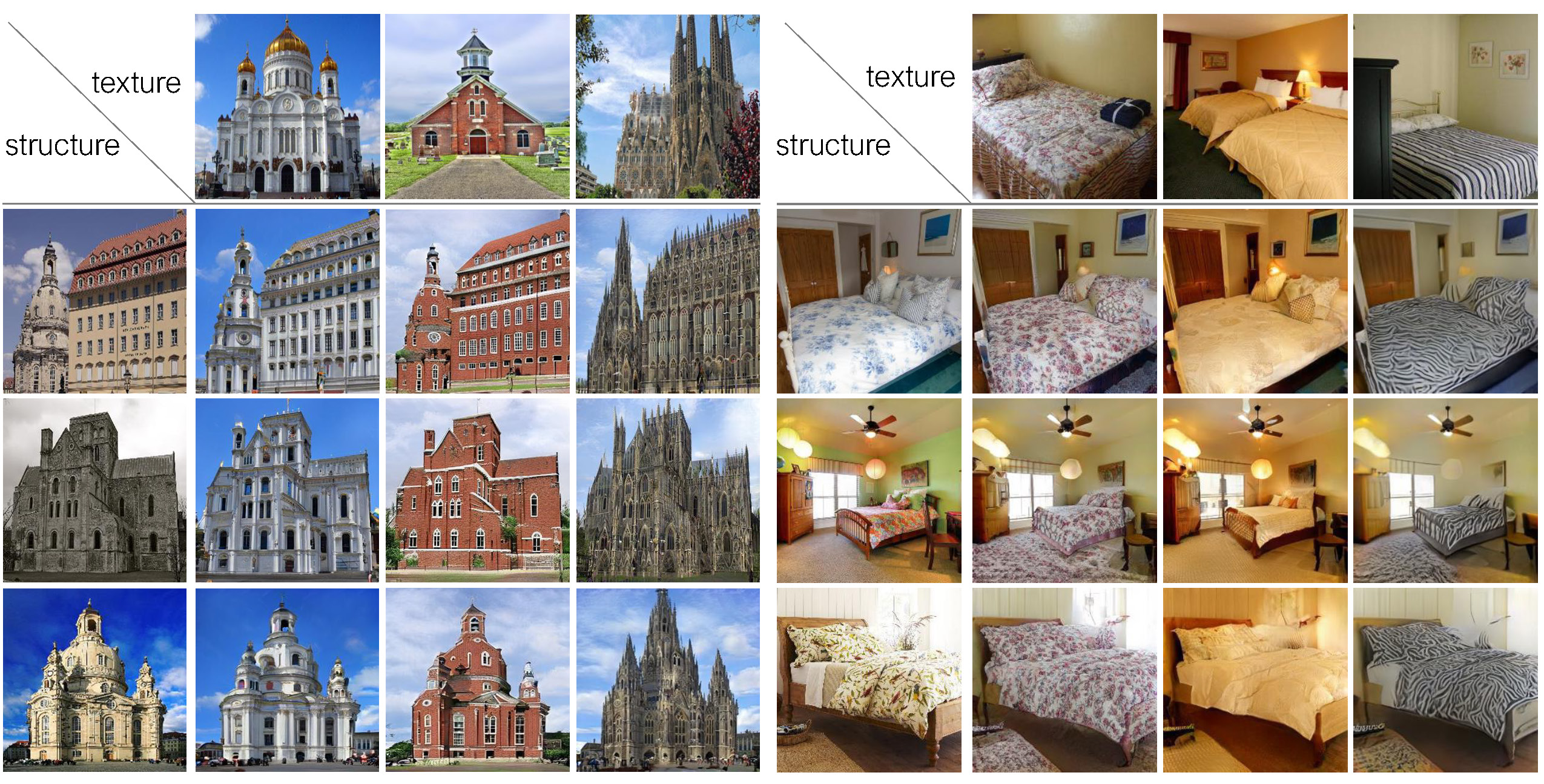 我们的交换自编码器能够学习将纹理与结构分离,从而实现诸如纹理交换之类的图像编辑任务。每一行展示了最左侧图像的结构代码与上方图像的纹理代码结合后的结果。