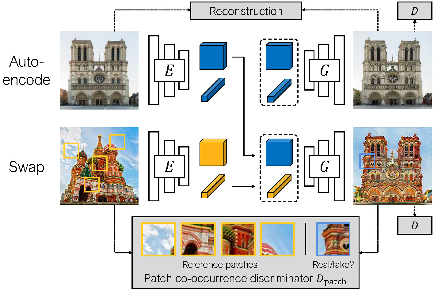 交换自编码器由编码(顶部)和交换(底部)两部分组成。 顶部:编码器 E 将输入图像(巴黎圣母院)编码为两个代码。结构代码是一个具有空间维度的张量;纹理代码是一个 2048 维向量。使用生成器 G 解码后应生成一张逼真的图像(由判别器 D 确保与输入匹配,即重建损失)。 底部:使用来自第二张图像(圣巴西尔大教堂)的纹理代码解码时,应在判别器 D 的监督下看起来逼真,并且纹理与目标图像一致。为此,通过训练一个补丁共现判别器 Dpatch 来确保输出图像和参考图像的局部区域难以区分。