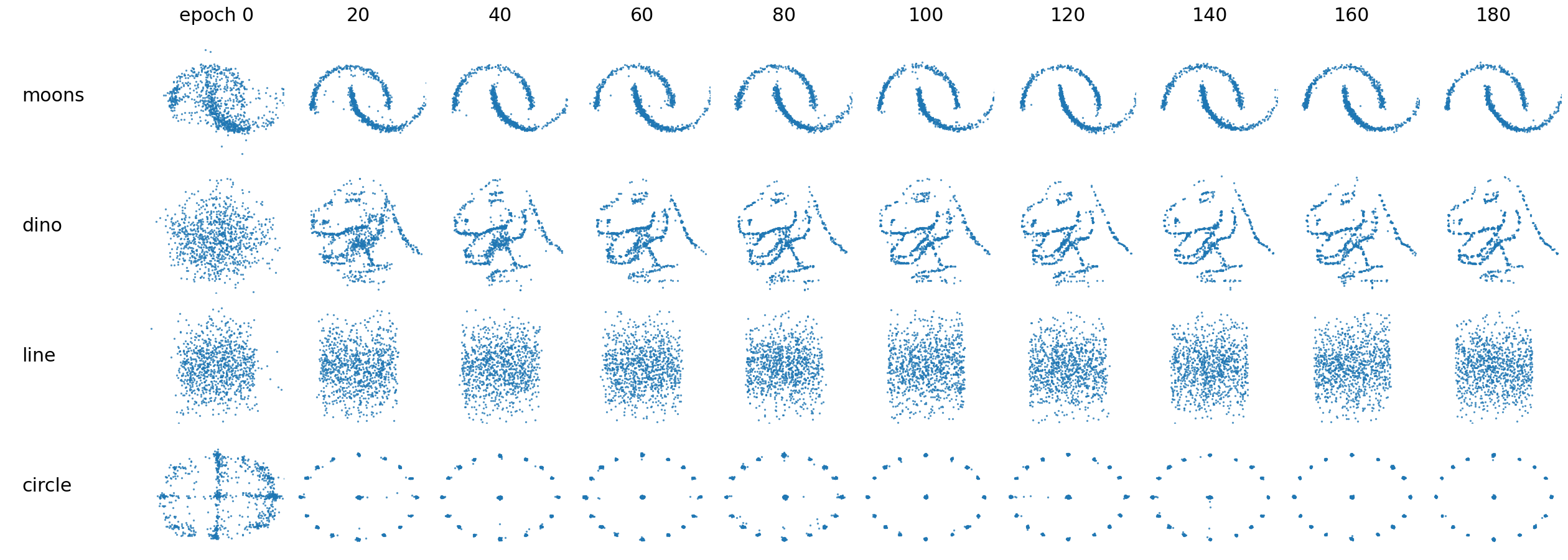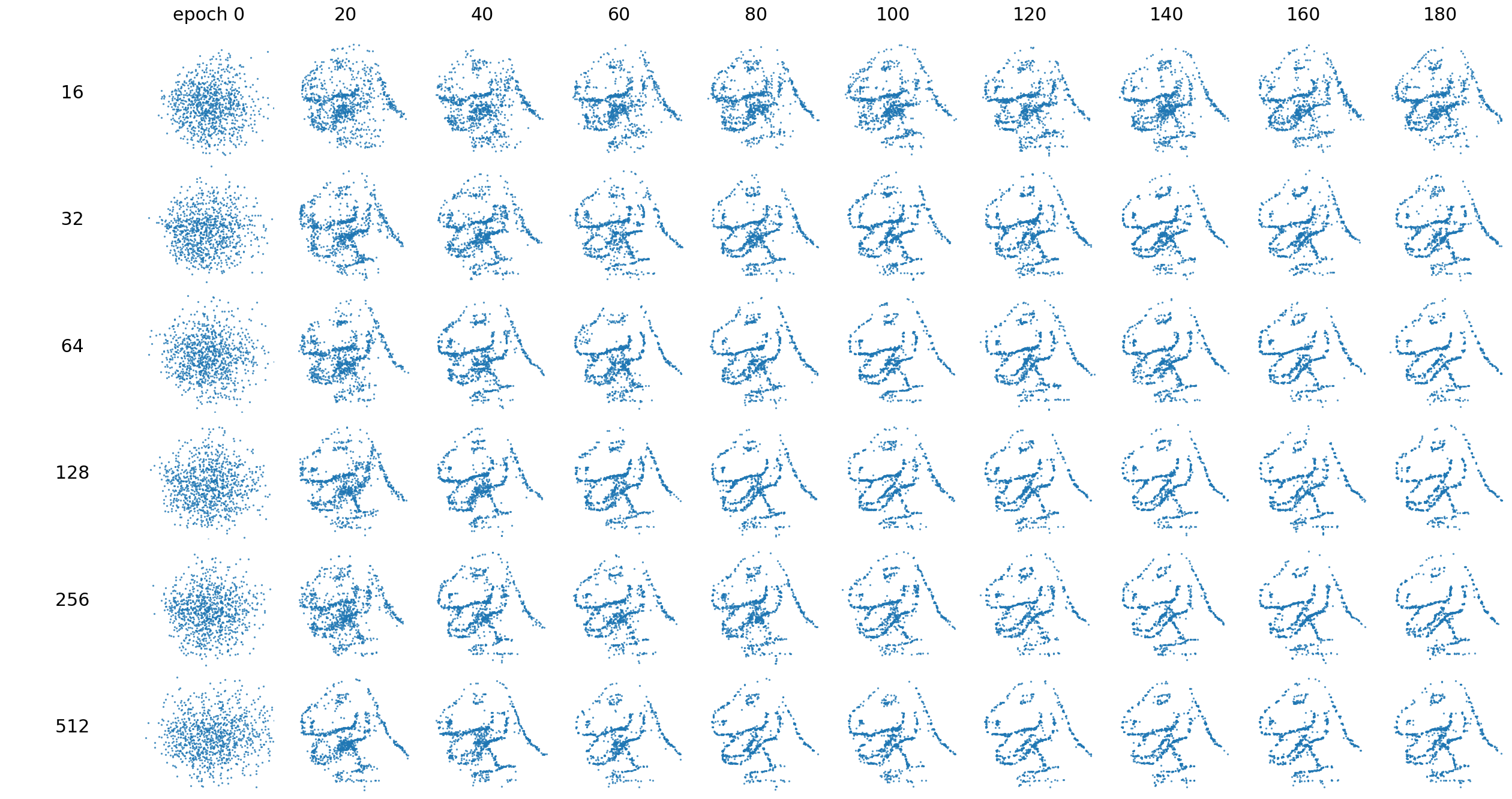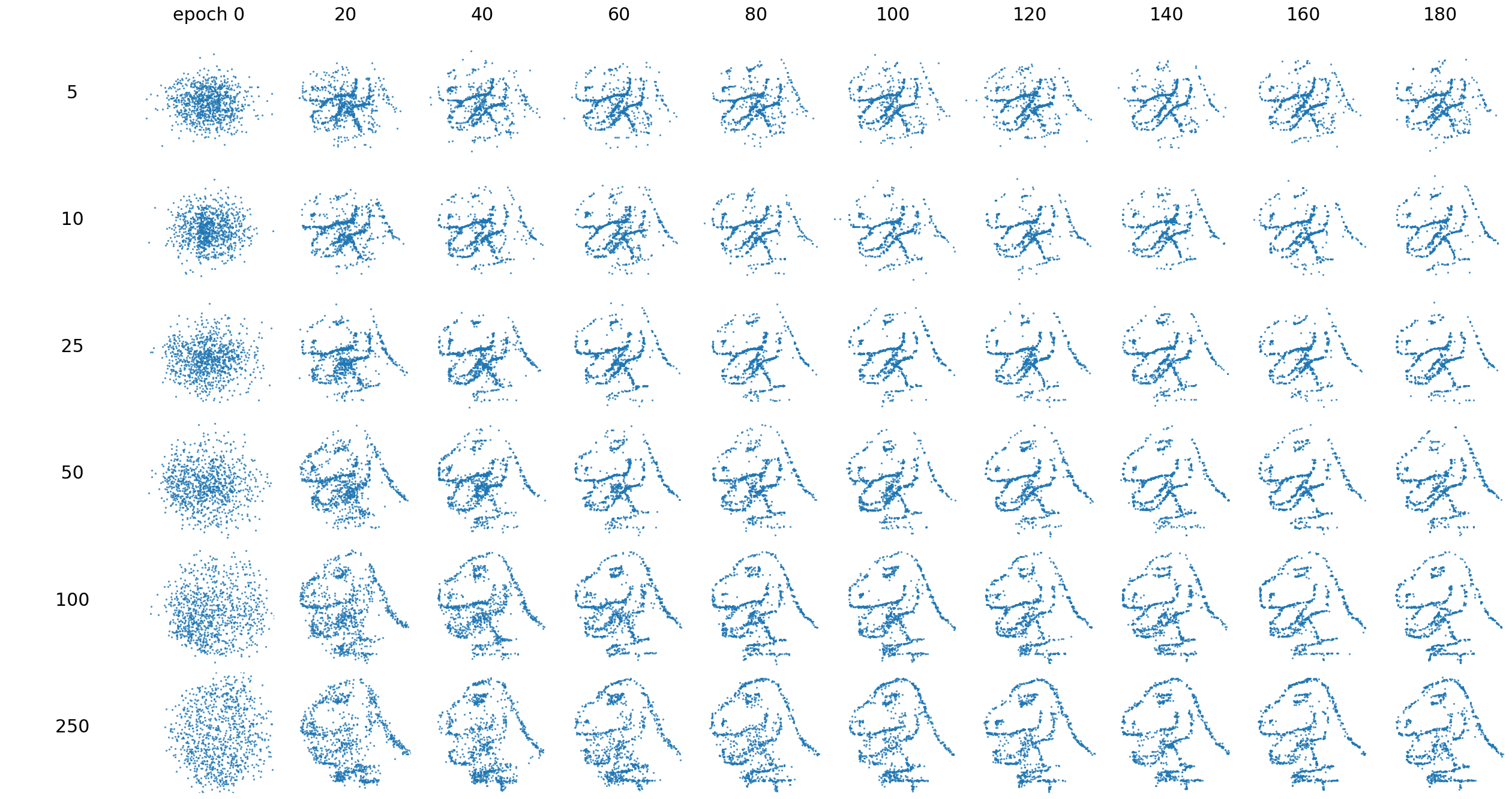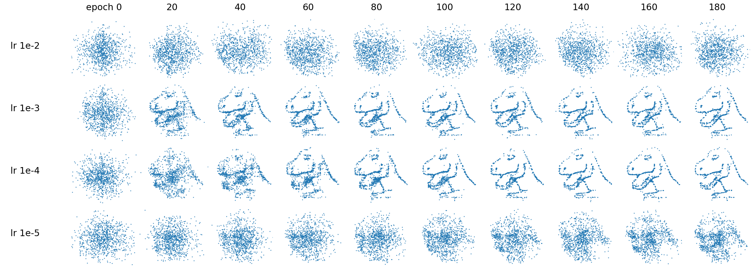 我针对学习率、模型大小等超参数进行了一系列消融实验,并对学习过程进行了可视化。图表中的列代表检查点的轮次,行则表示超参数的取值。每个单元格显示了一千个生成的二维点。