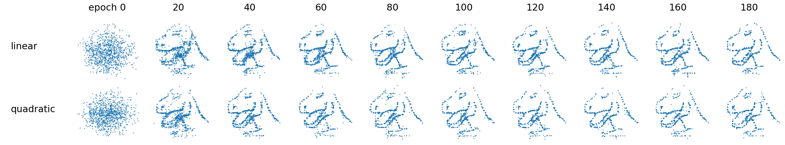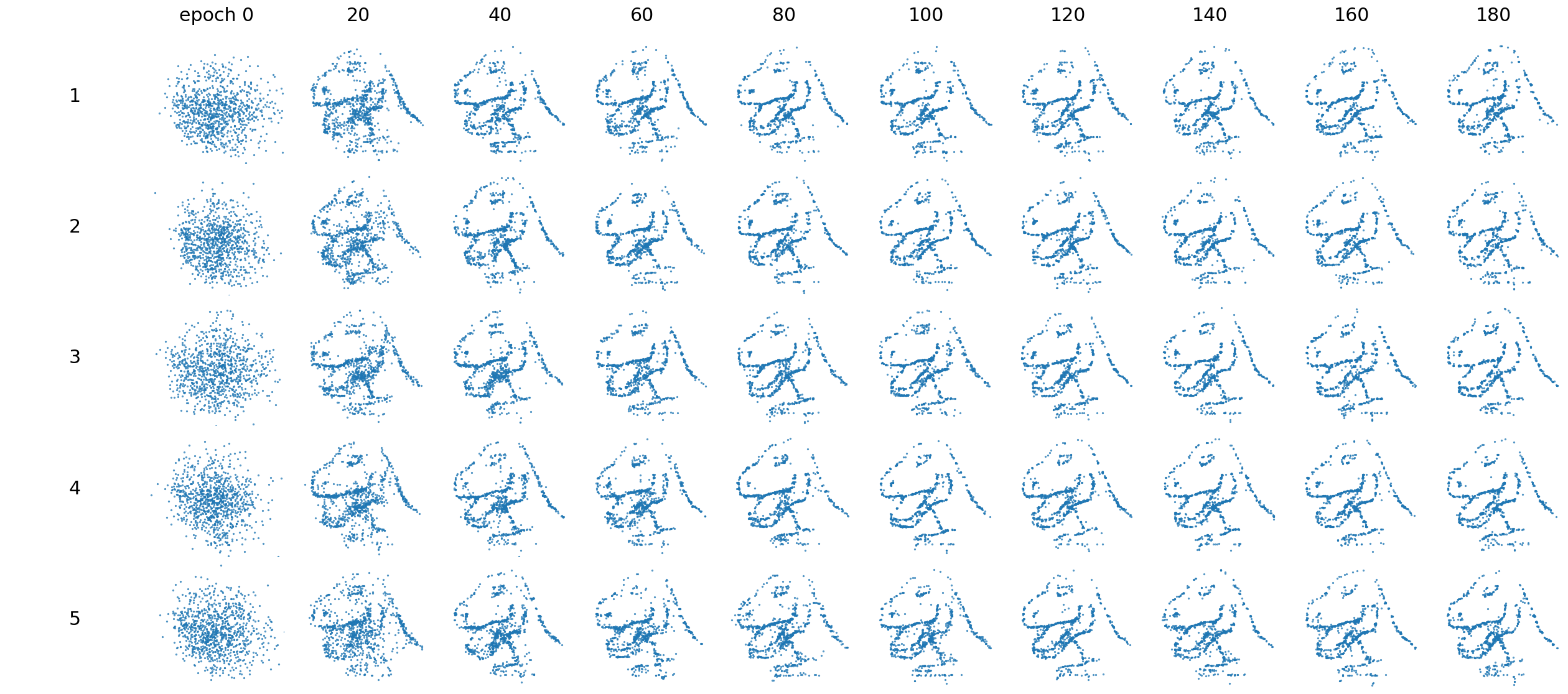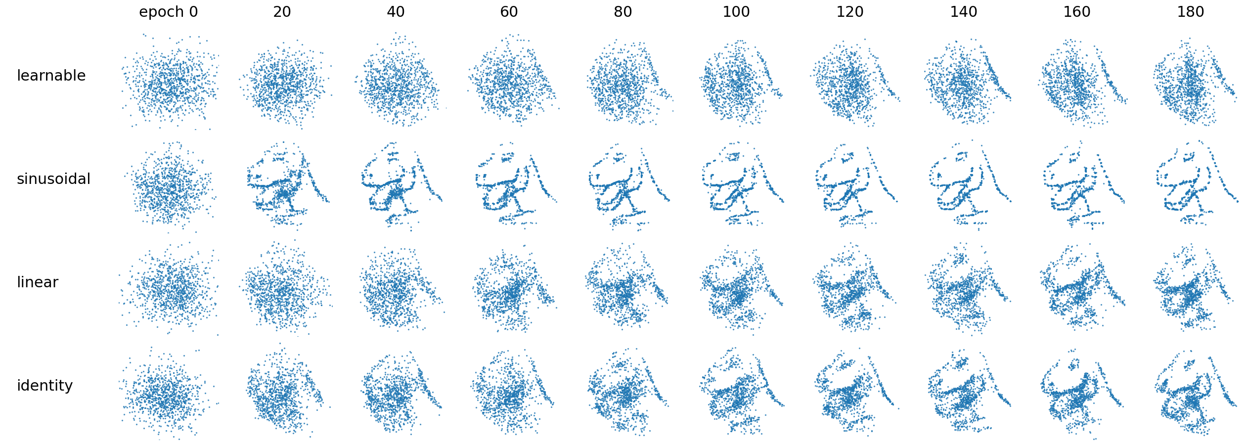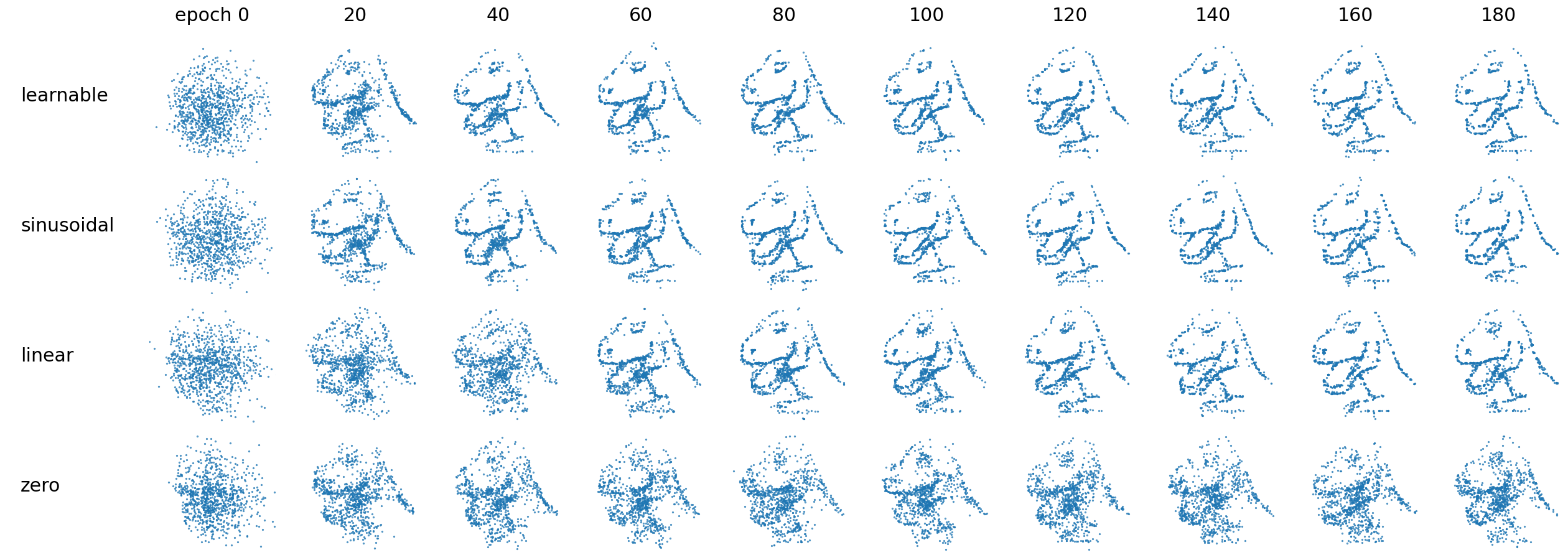 我针对学习率、模型大小等超参数进行了一系列消融实验,并对学习过程进行了可视化。图表中的列代表检查点的轮次,行则表示超参数的取值。每个单元格显示了一千个生成的二维点。