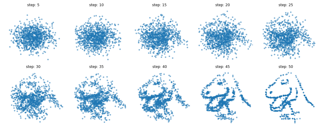 对一千个二维点的数据集应用前向扩散过程的可视化展示。请注意,这只恐龙并不是单个训练样本,它代表了数据集中每一个二维点。