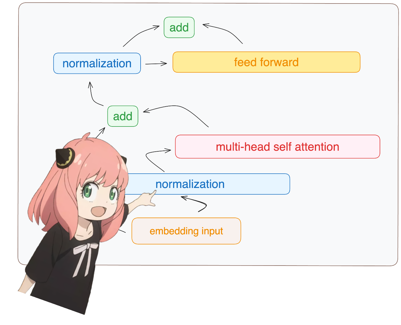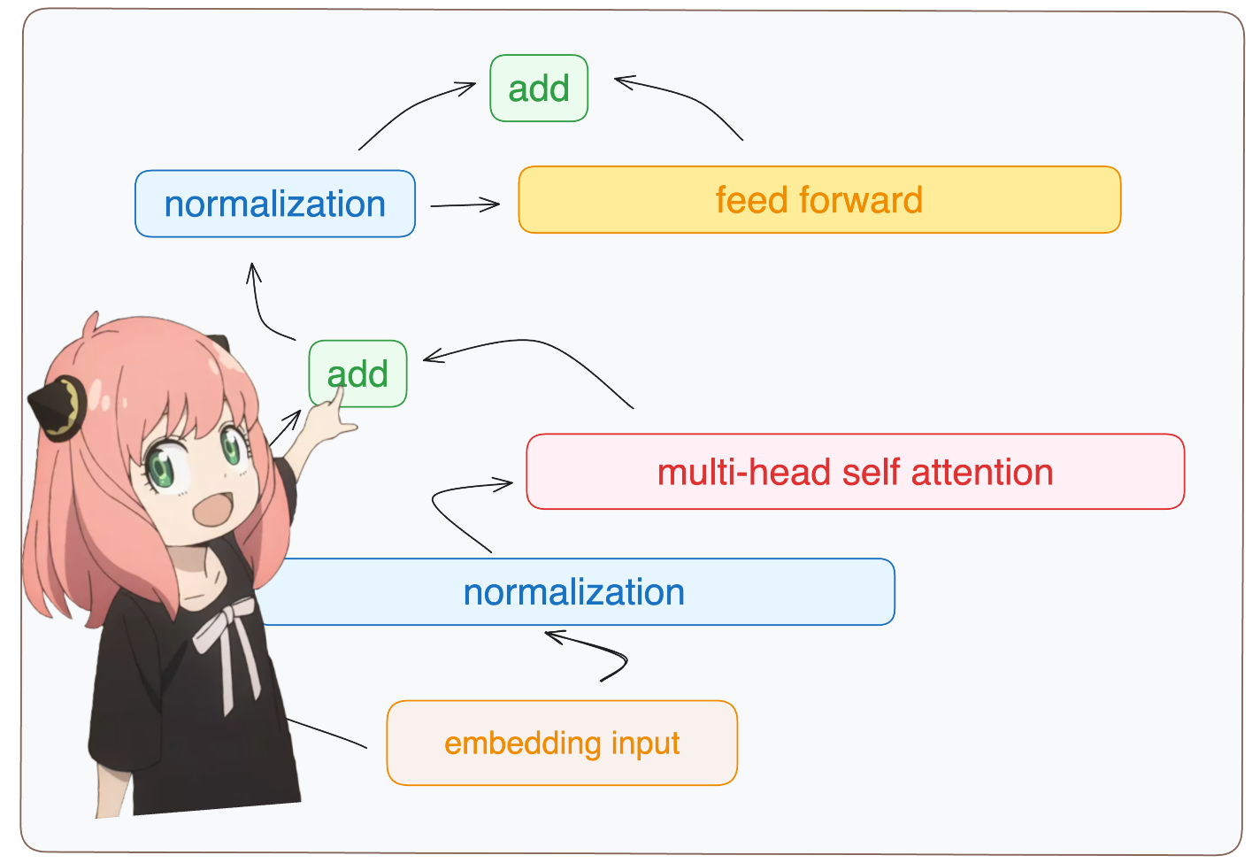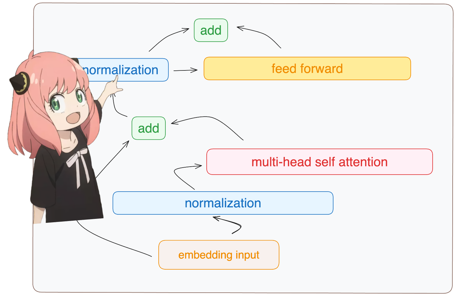 在每个Transformer块中,第二个“add”操作的输入应该是前馈层的输出和第一个“add”操作的输出,而不是归一化后的结果。