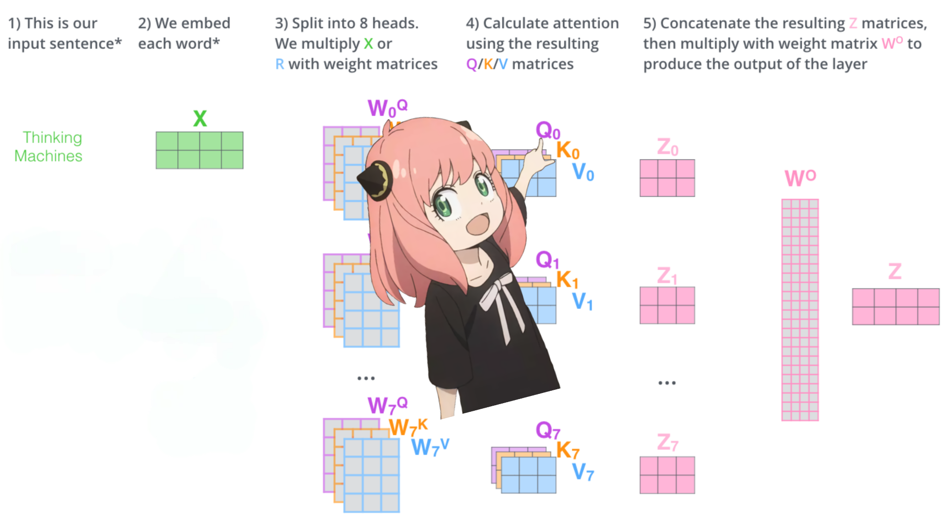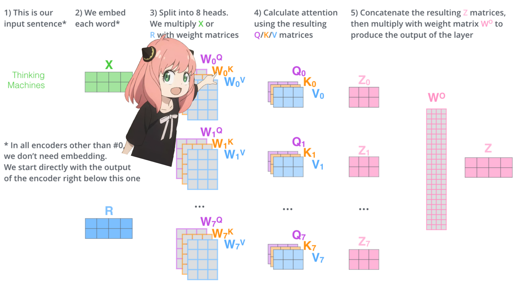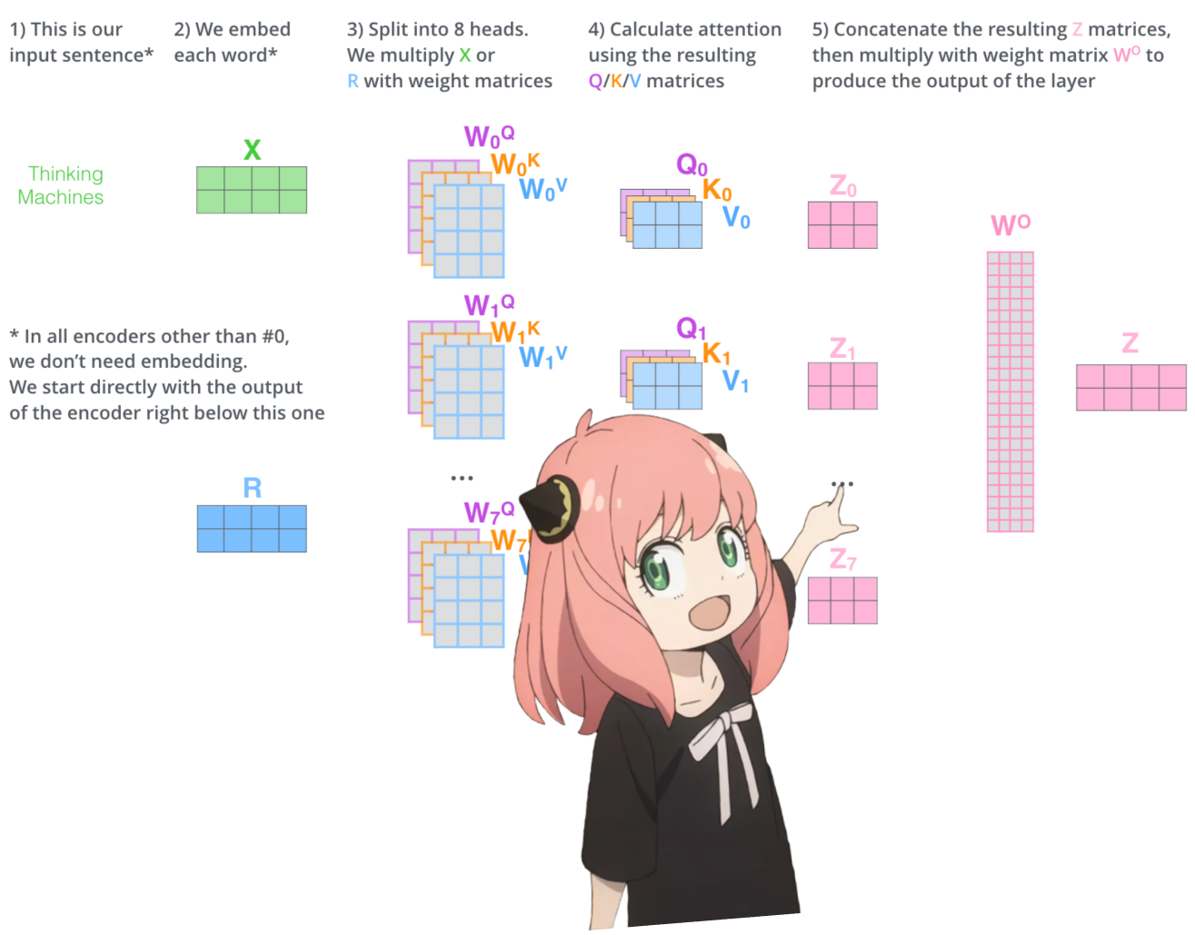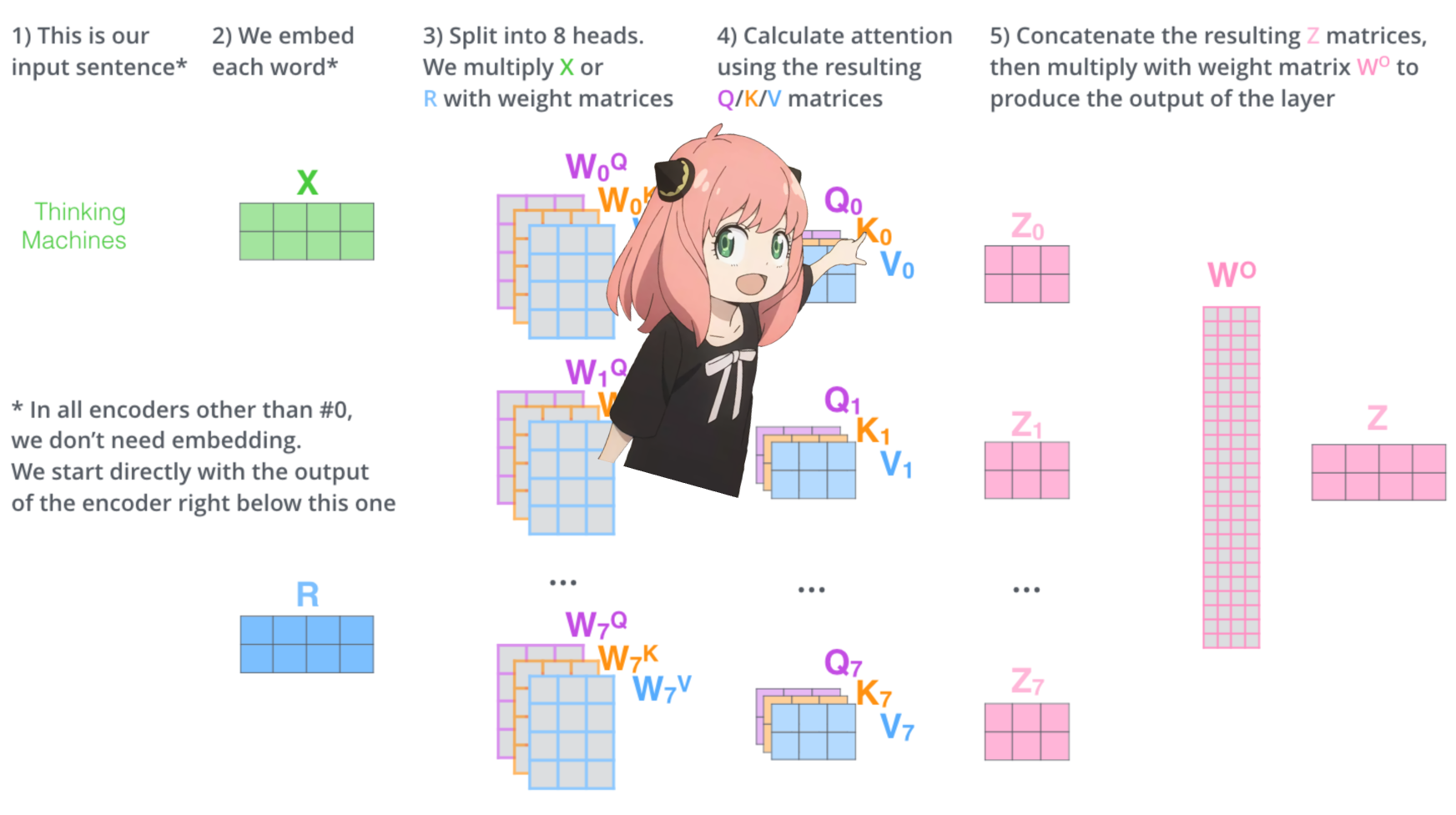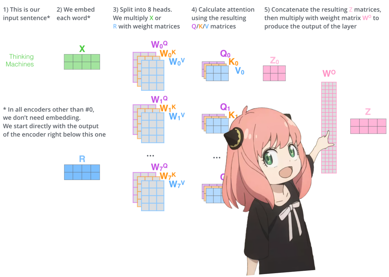 - 计算QKV向量:每个标记向量都乘以相同的QKV权重矩阵来得到结果,不涉及其他标记。