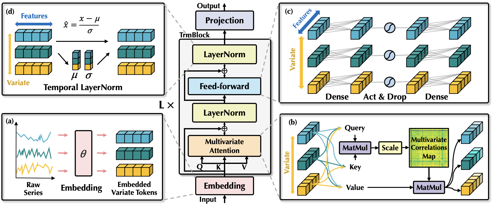 - (右)反转自注意力模块能够学习可解释的多变量相关性。