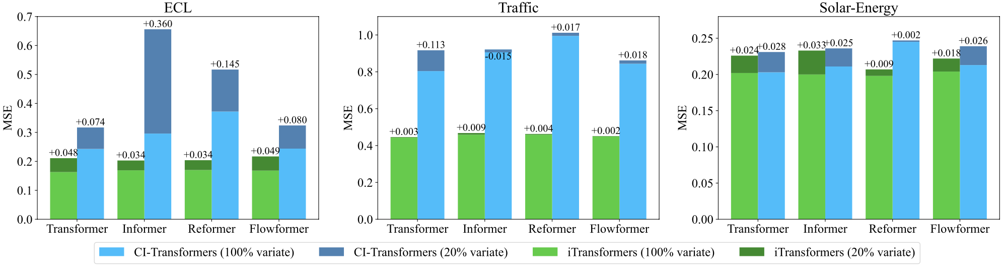 从技术上讲,iTransformer能够预测任意数量的变量。我们在部分变量上训练iTransformer,并对未见过的变量进行了预测,表现出良好的泛化能力。