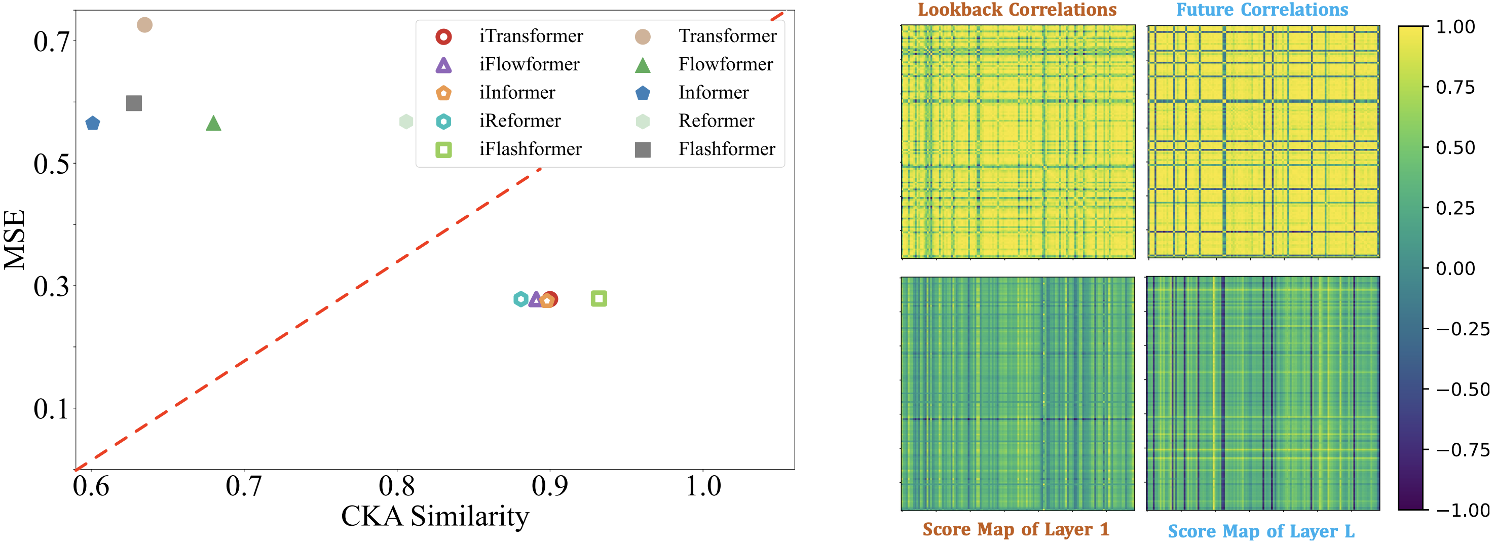 - (左)反转Transformer能够学习更好的时间序列表示(与CKA更为相似),更有利于预测。