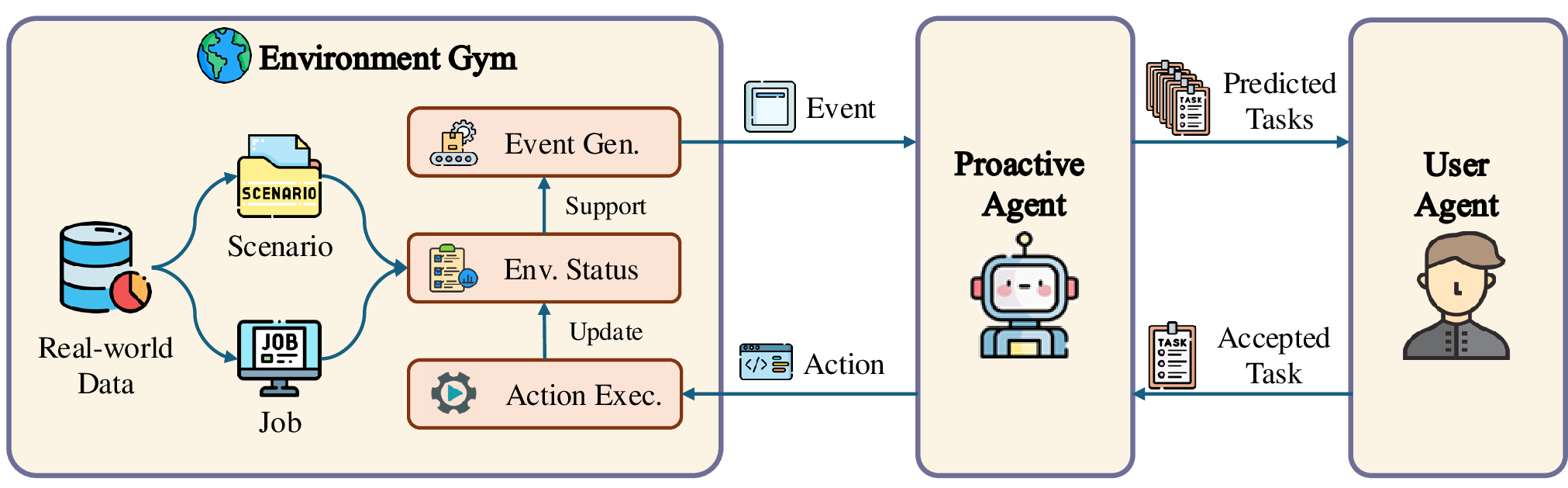 本项目(主动智能体)旨在构建一个完全主动的智能体,该智能体能够预测用户需求并主动提供帮助、提出行动建议,而无需用户明确请求。我们通过开发数据收集与生成流水线、构建自动评估器,并在生成的数据上训练智能体来实现这一目标。目前,我们提供了完整的数据收集与生成流水线、数据集及其对应的评估脚本,以及用于微调大型语言模型以实现主动智能体功能的提示词。