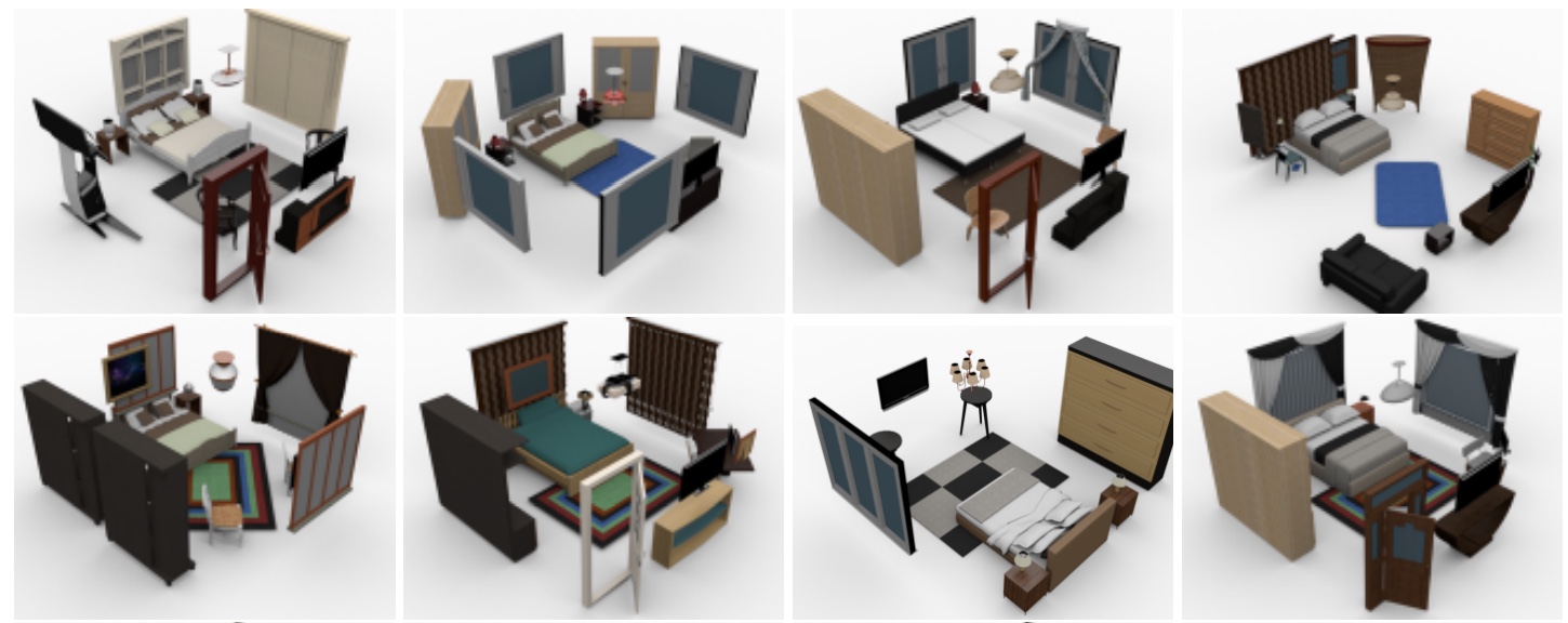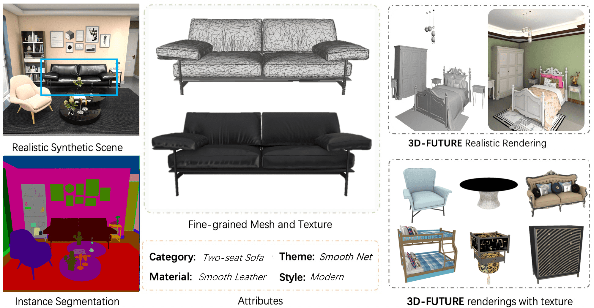 3D-FUTURE包含5,000多个多样化房间中的20,000多个干净且逼真的合成场景,其中包括由专业设计师开发的10,000多个具有高分辨率、信息丰富纹理的独特高质量3D家具实例。
