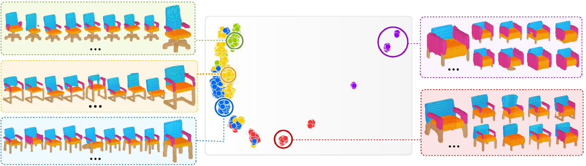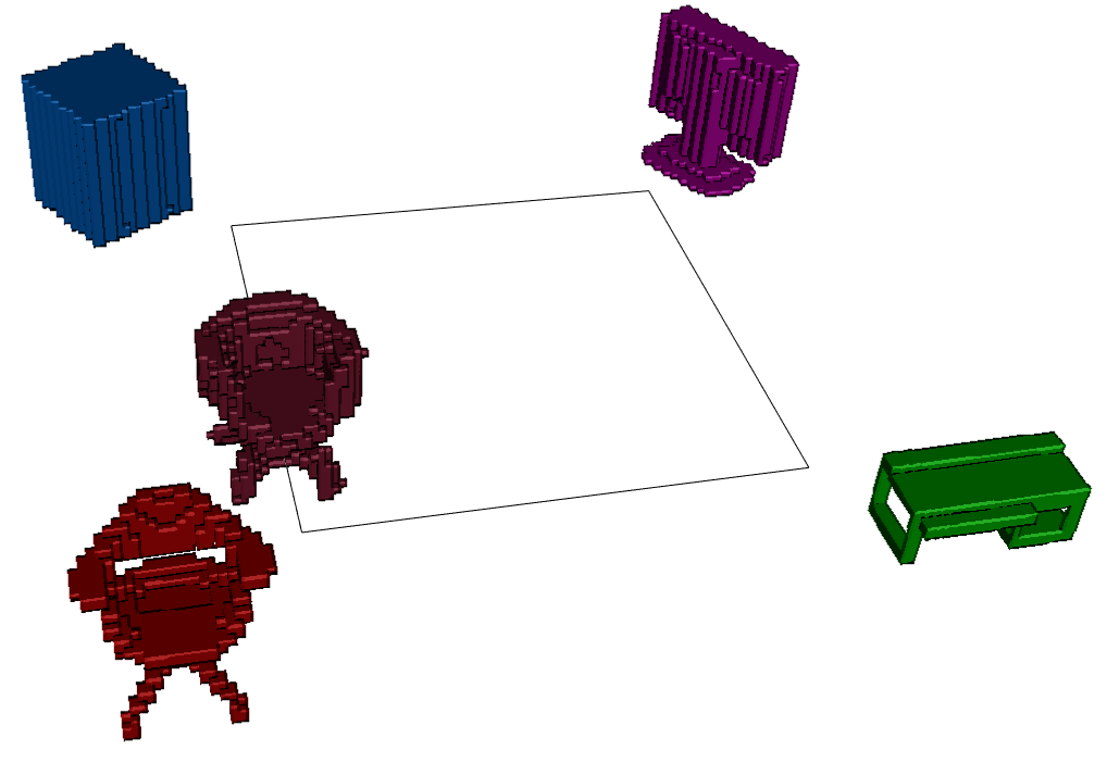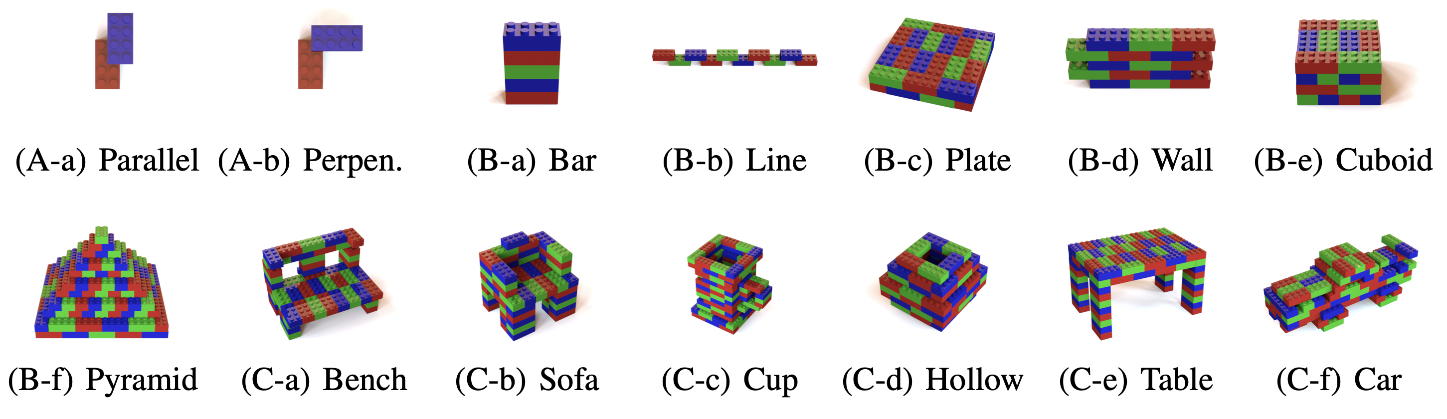 组合式3D形状数据集由14个类别的406个实例组成。我们数据集中的每个物体都被视为一系列基本体素放置的等价物。与其他3D物体数据集相比,我们的数据集包含了单元体素的组装序列。这意味着我们可以快速获得一个模拟人类组装过程的顺序生成流程。此外,在验证采样序列的有效性后,我们还可以从给定的组合式形状中随机采样有效的序列。综上所述,我们的组合式3D形状数据集具有以下特点:(i) 组合性,(ii) 顺序性,(iii) 可分解性,以及 (iv) 可操作性。