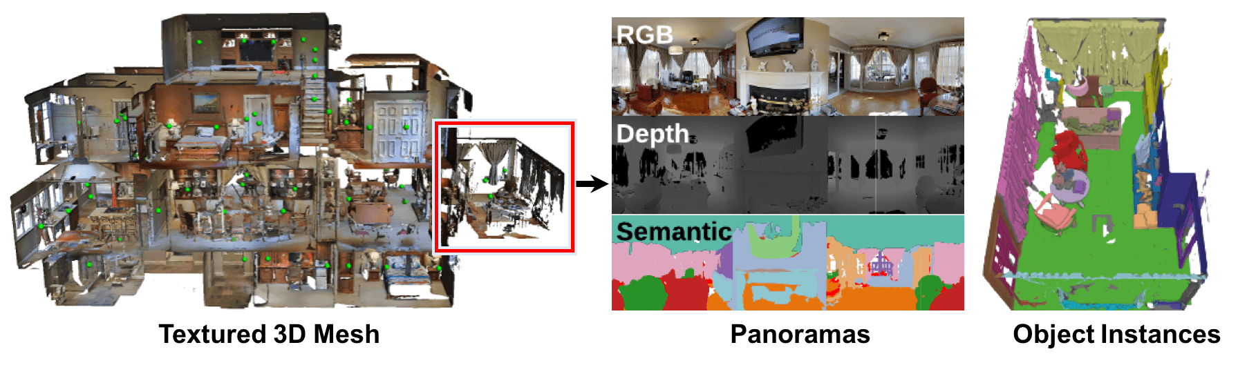 来自90个私人房间尺度场景的194,400张RGB-D图像中提取的10,800张全景视图(同时包含RGB和深度信息)。针对区域(客厅、厨房)和物体(沙发、电视)类别提供了实例级语义分割。