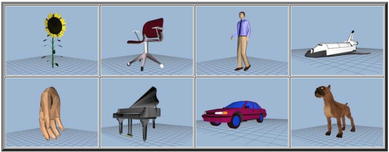 共收集了1,814个来自网络的.OFF格式模型,用于评估基于形状的检索和分析算法。