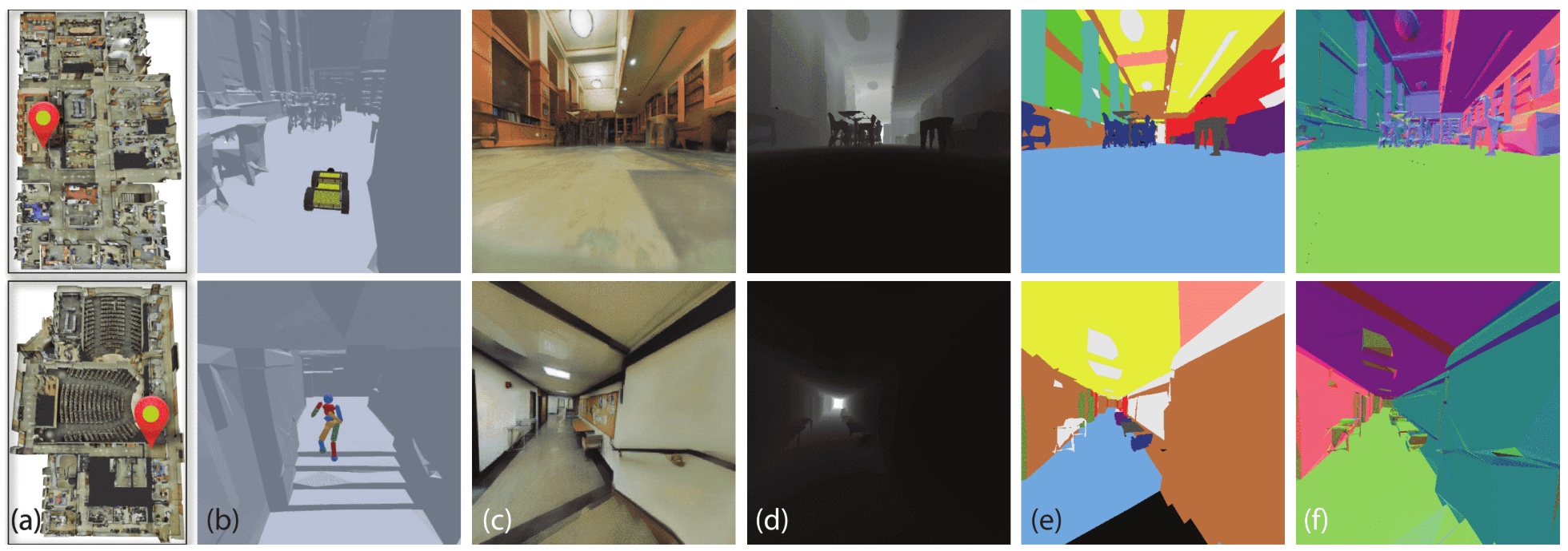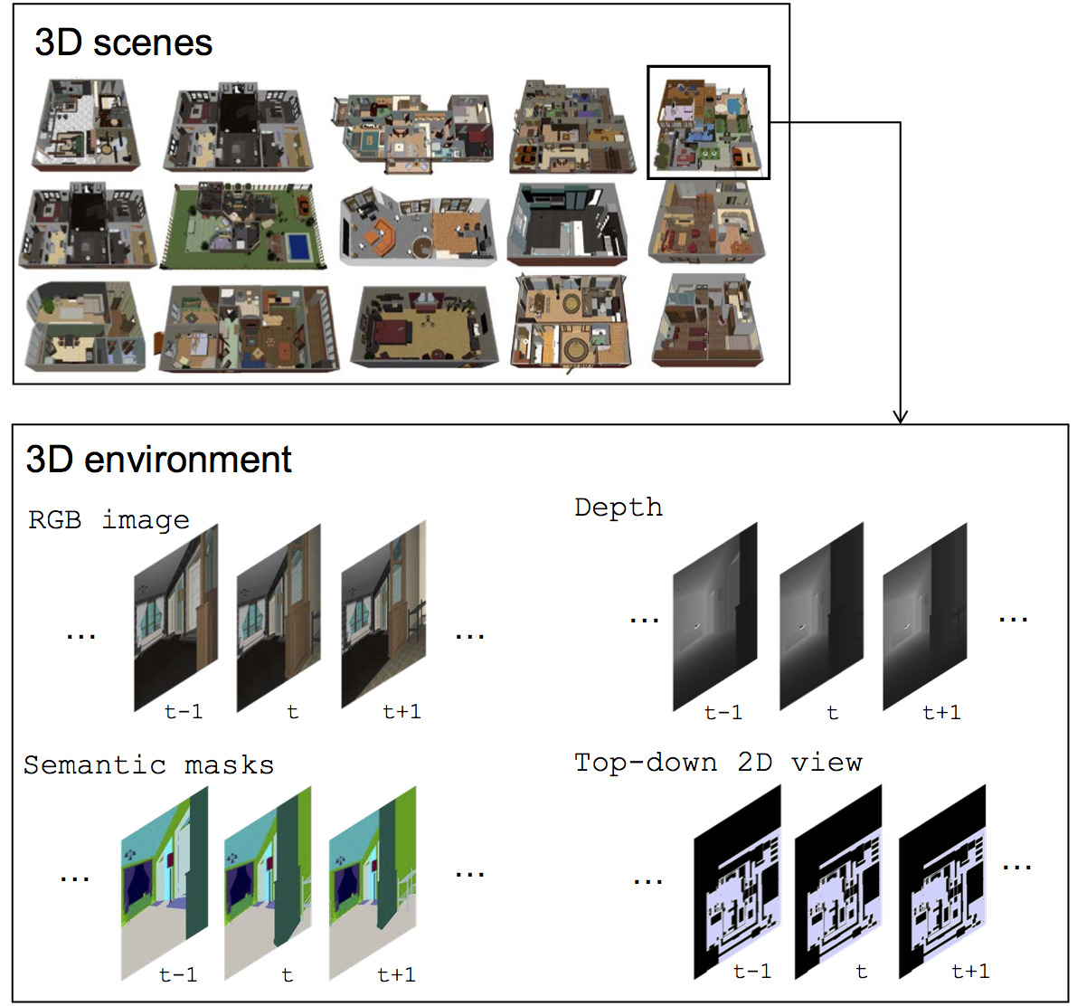 House3D是一个虚拟3D环境,包含4.5万个室内场景,涵盖了来自SUNCG数据集的多样化场景类型、布局和物体。所有3D物体均带有完整的类别标签。环境中的智能体可以获取多种模态的观测信息,包括RGB图像、深度图、分割掩码以及俯视二维地图视图。