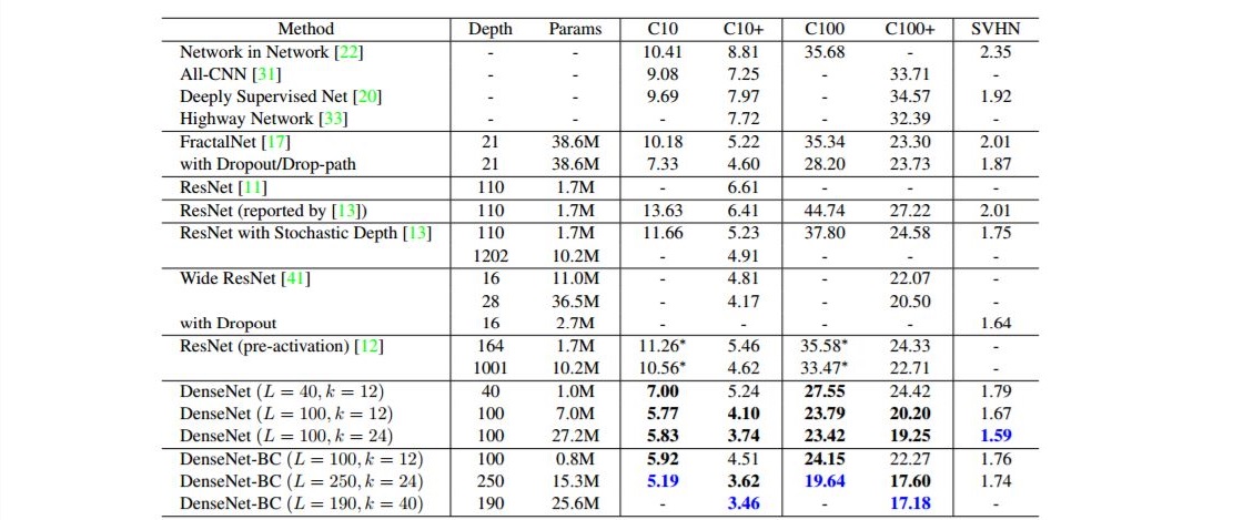 论文中提供了 DenseNet 的准确率,其在 CIFAR-10、CIFAR-100 和 SVHN 数据集上均超越了此前的所有基准。