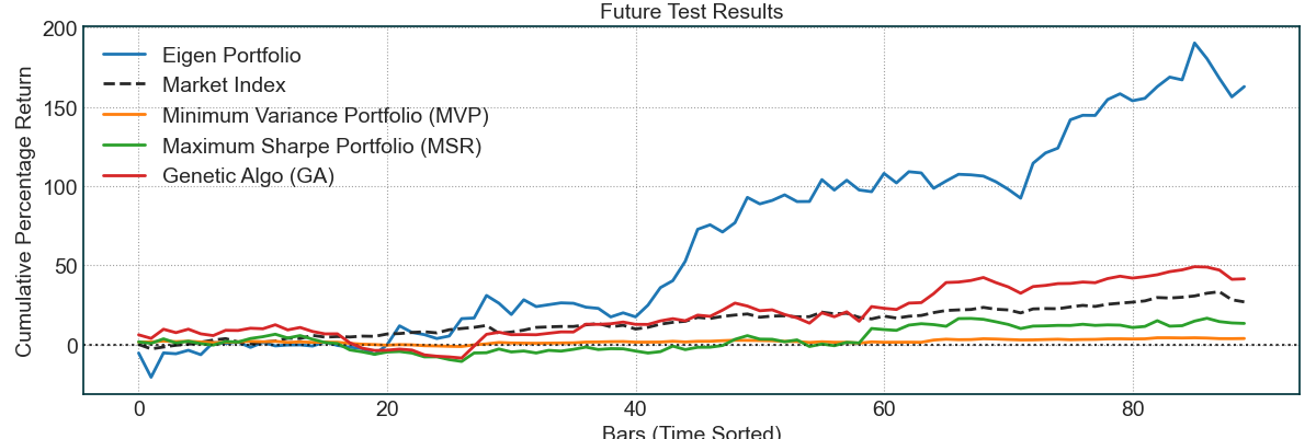 回测结果看起来相当令人鼓舞。黑色虚线代表市场指数,即QQQ。其他线条则代表不同的策略。我们自定义的遗传算法实现似乎表现最好,因为它是在其他策略基础上进一步优化的版本。而对TSLA权重最大的特征投资组合虽然波动性最高,但其收益也非常可观。最后,正如预期,MVP具有最小的方差,因此最终的收益也最低。不过,由于方差极低,它对于那些希望保持安全的人来说是一个不错的选择。接下来最有趣的部分来了,让我们来看看这些投资组合的前瞻性或未来测试结果。