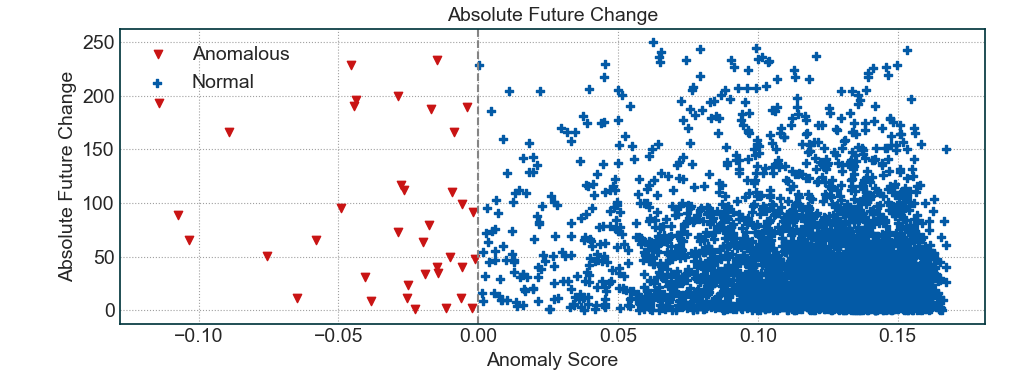 未来绝对涨跌幅与异常分数之间的相关系数(越低越好,范围为 (-1, 1)):**-0.23**